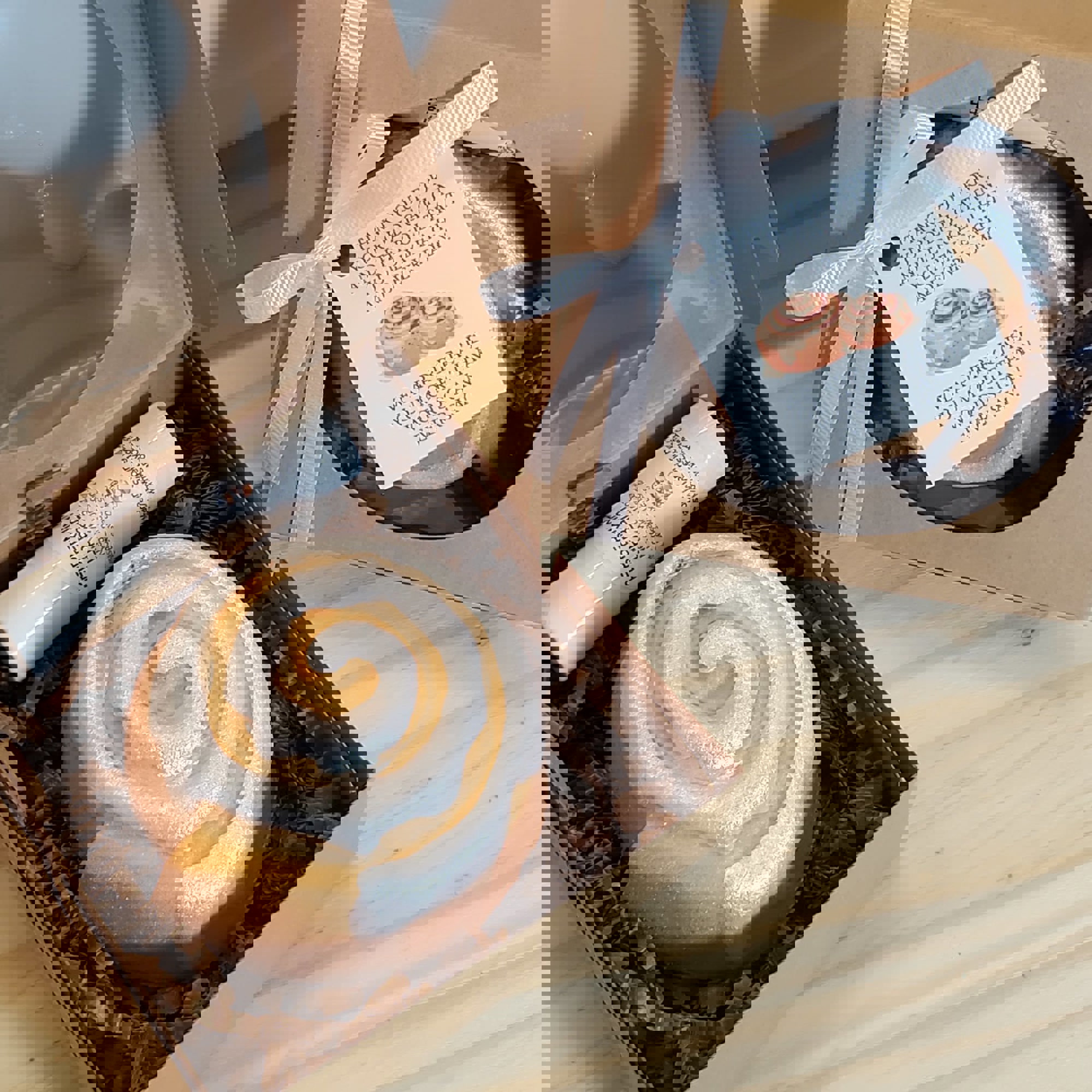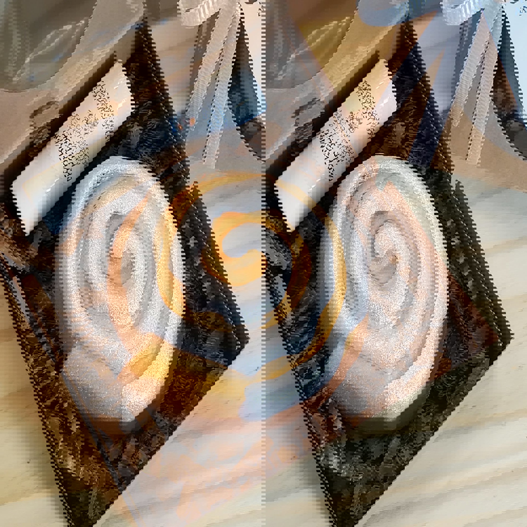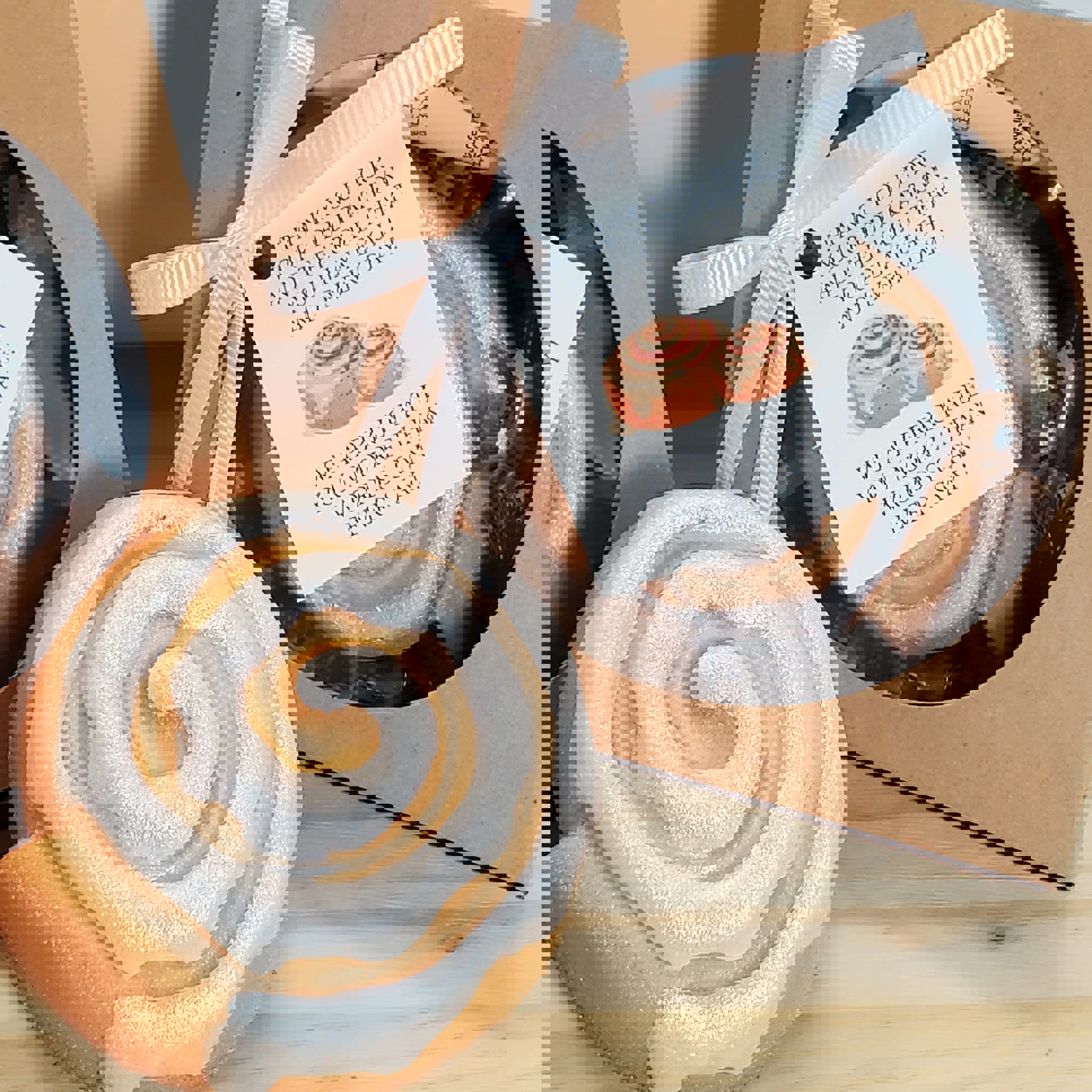 CINNAMON ROLL bath bombs are a white bath bomb base color, that is then airbrushed to add that pop of color and finished with hand painted details to make it look more realistic. This is a favorite and back for teacher appreciation and/or fall thankful teacher gift's.