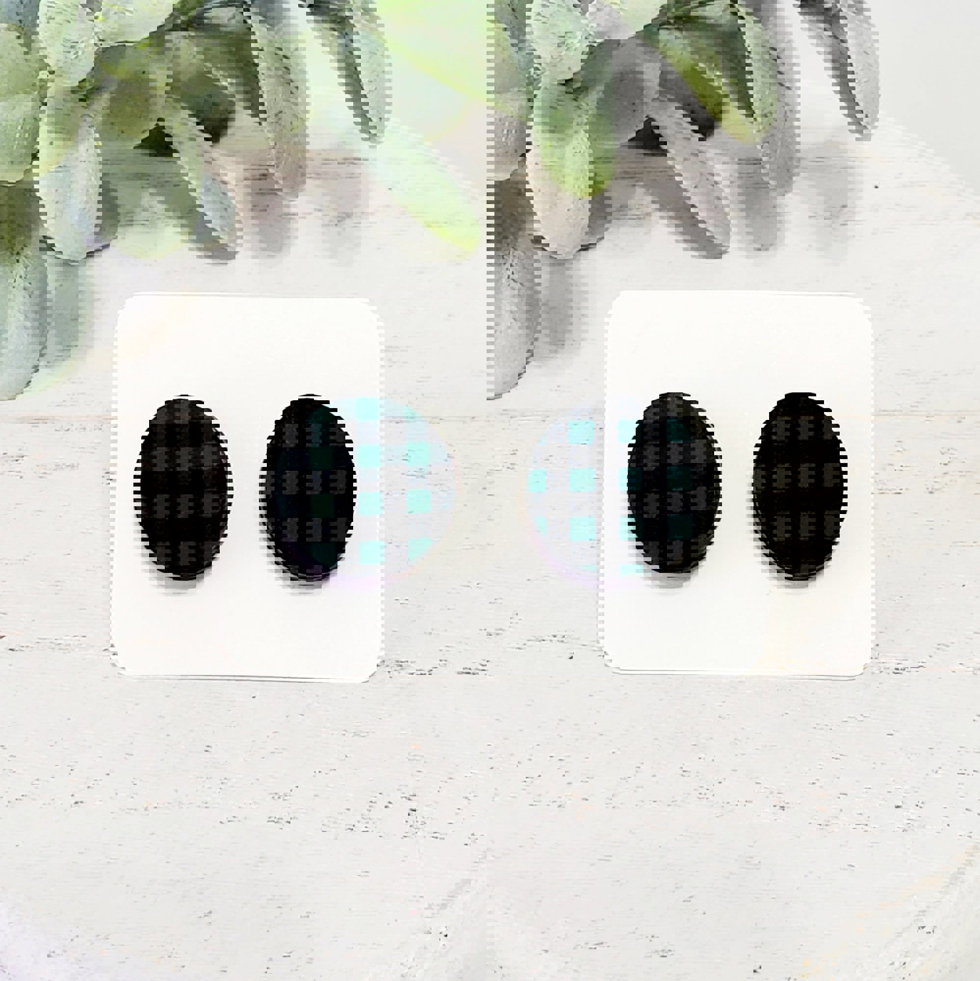 Product Details: Printed dark green plaid on wood Size: 12MM Surgical steel posts for sensitive ear Handmade in USA