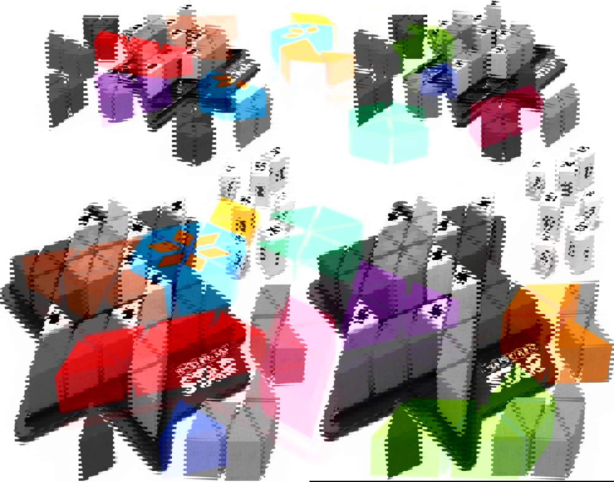 • This tabletop game is well-designed and includes star-shaped grids, dice, 7 triangle blockers, and 11 different shapes with different colors. Easy to travel with and simply have fun