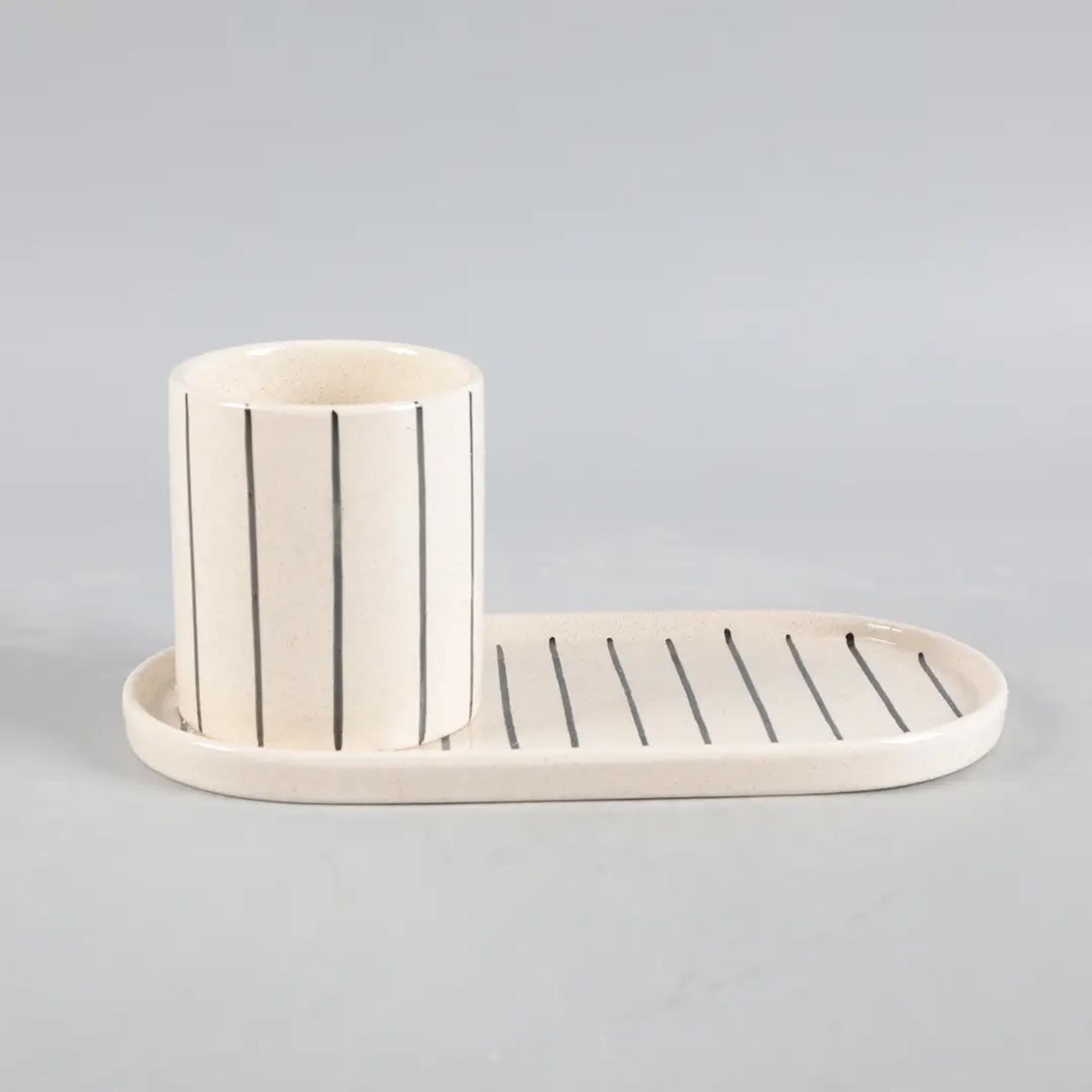 Elevate your desk with this 10" Ceramic Tray with Pencil Holder, a modern workspace essential that blends organization with clean, minimalist style. Designed in a speckled ivory ceramic with hand-painted black stripes, this two-piece set features a removable pencil cup and an elongated tray—perfect for creating a curated, clutter-free desktop.