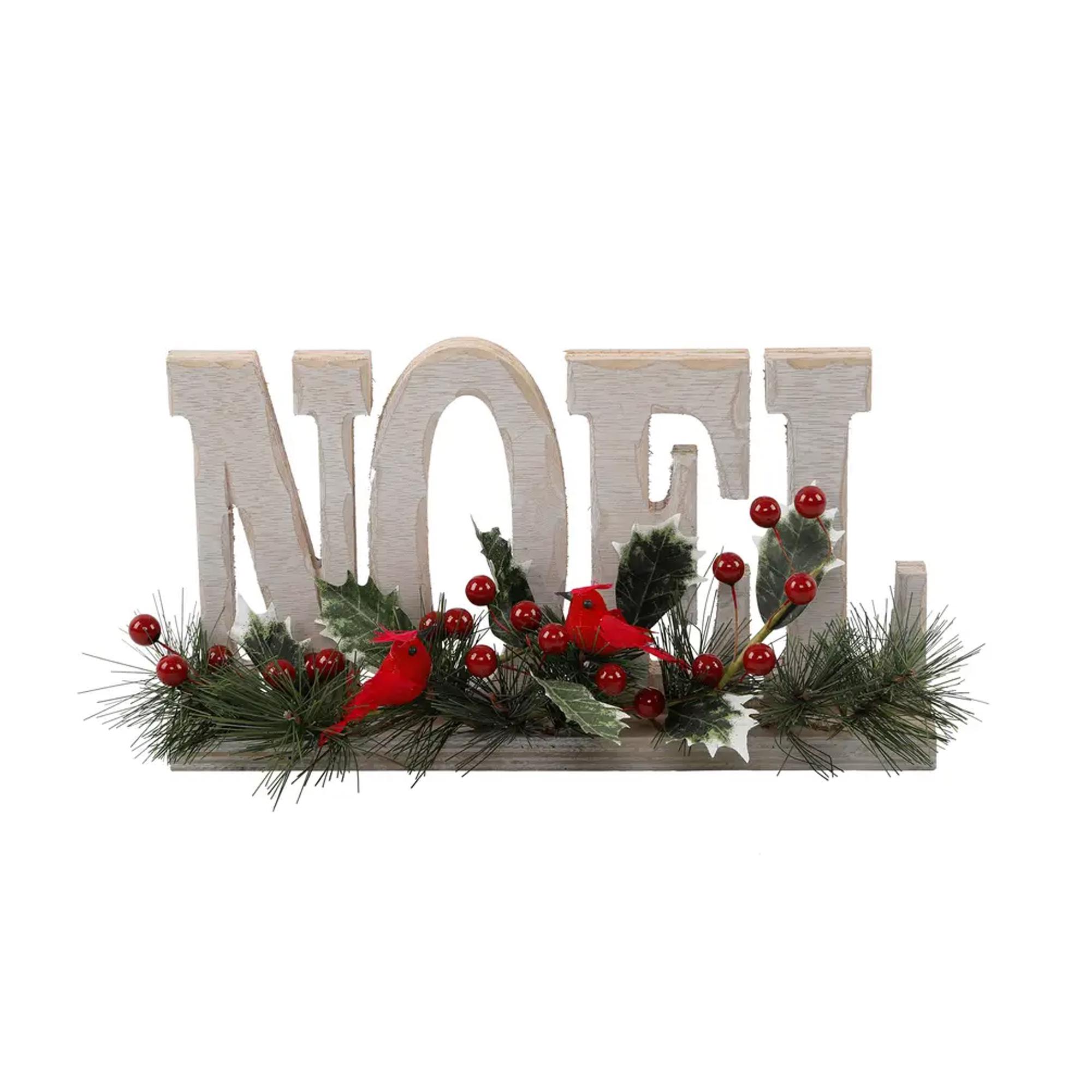 The distressed wood-style NOEL lettering adds rustic charm, while the lush pine branches, holly leaves, and vibrant cardinals create a warm, nature-inspired look. Perfect for farmhouse, traditional, and rustic holiday themes, this decorative accent instantly elevates seasonal displays without requiring any assembly.