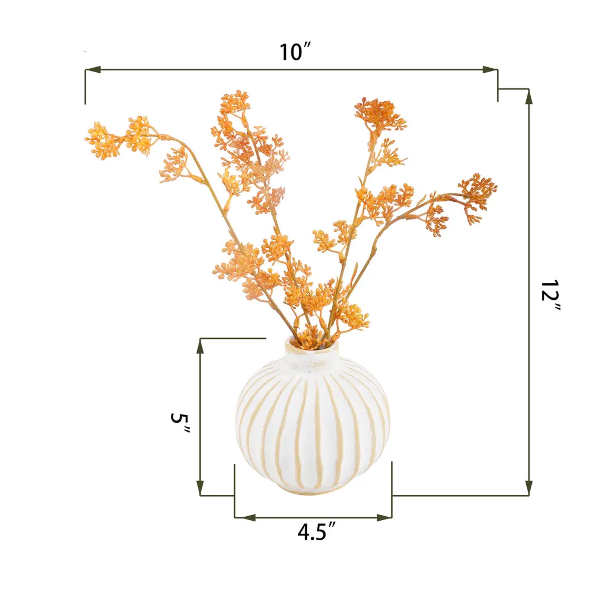 The round white ceramic vase features raised vertical striping, giving it a handmade artisan feel that complements farmhouse, boho, rustic, and minimalist décor styles. The included faux branch showcases rich golden-orange foliage—perfect for fall displays, Thanksgiving décor, and year-round earthy styling. Its neutral yet eye-catching design makes it a versatile décor item for shelves, mantels, centerpieces, entry tables, and retail merchandising.