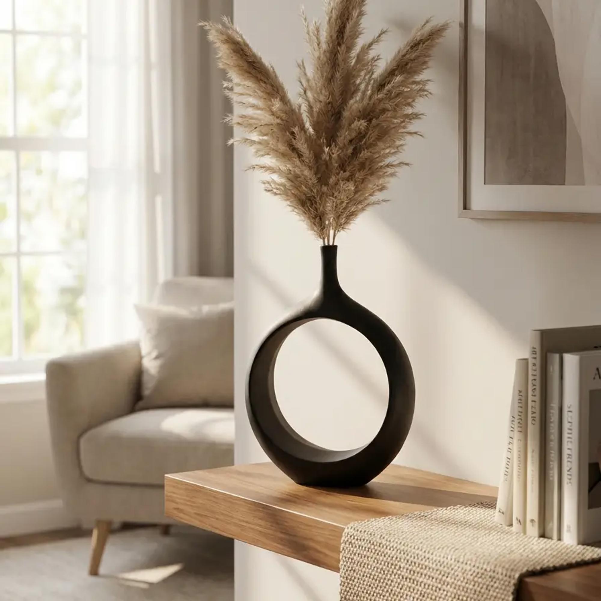 Elevate your modern décor collection with this Matte Black Sculptural Round Vase, a bold and artistic statement piece designed for contemporary homes, boutiques, and curated retail displays. The unique open-circle silhouette paired with a sleek matte finish gives this vase a gallery-inspired look—perfect for customers who love minimalist, modern, or high-design décor.