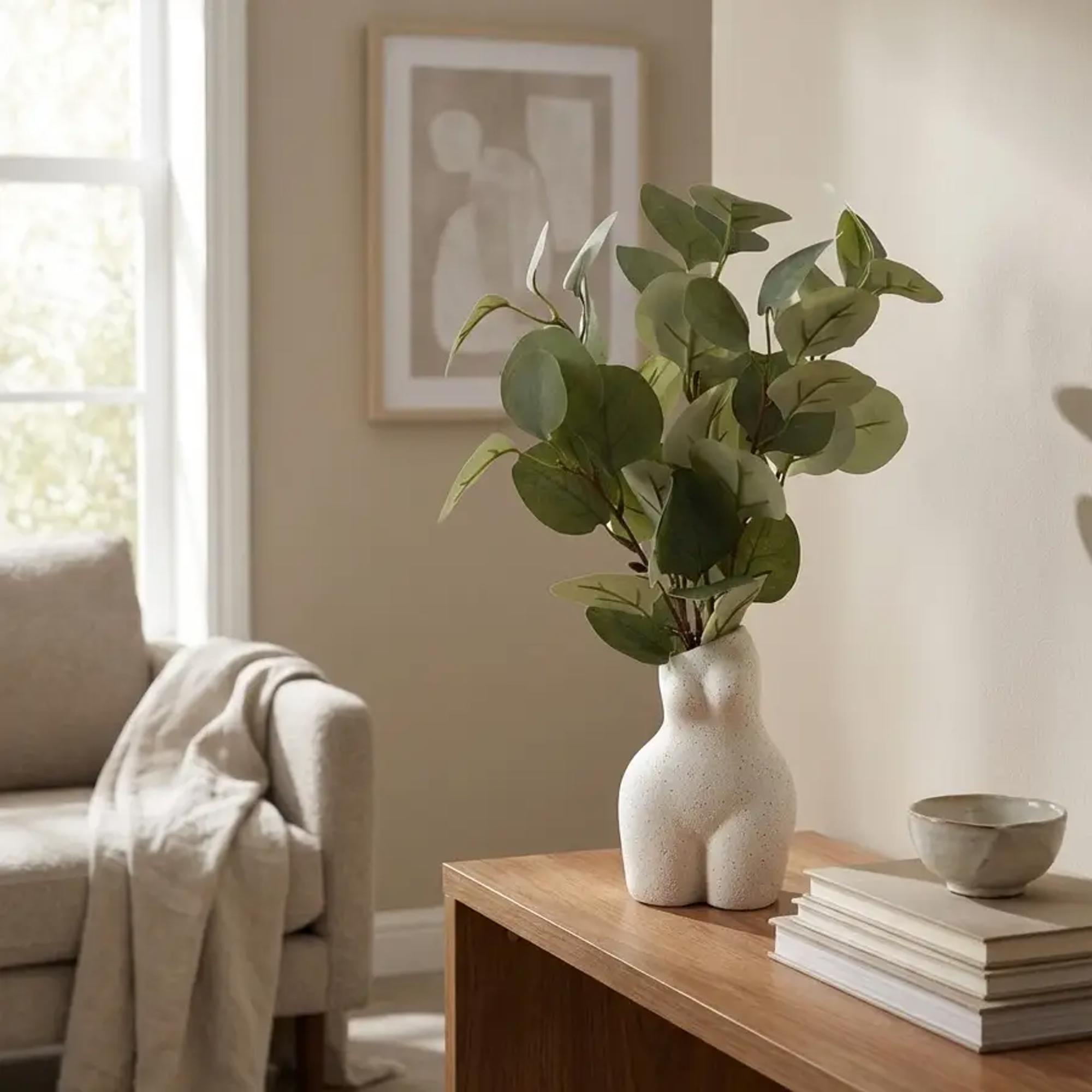 The included faux eucalyptus stems are lush, full, and lifelike, offering year-round greenery without maintenance. Their soft sage tones add freshness and balance to the artistic statement of the vase, making this accent piece ideal for bedrooms, living rooms, entryways, and retail displays.