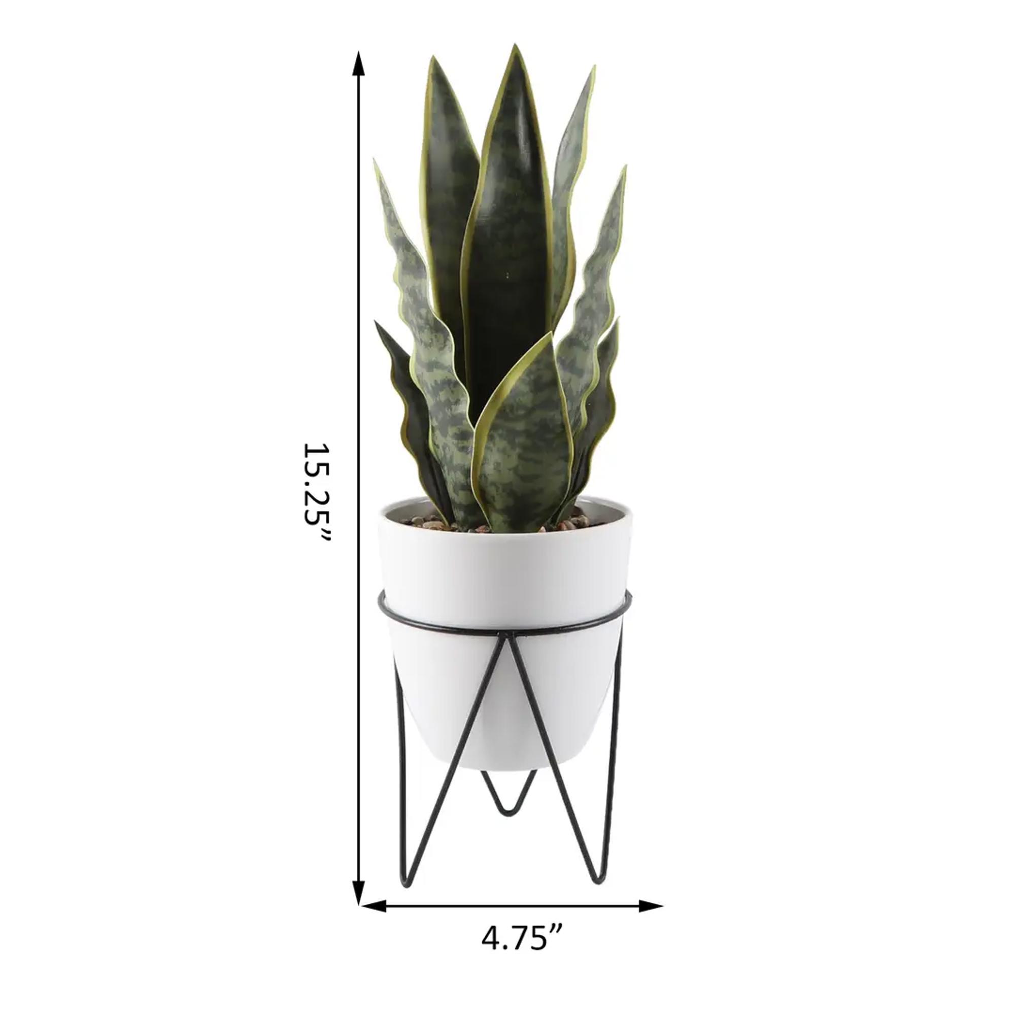 This lifelike sansevieria features tall, variegated leaves with realistic texture and shape, creating a bold vertical element ideal for desks, shelves, side tables, and small spaces. The plant is set in a smooth white ceramic pot, paired with a contemporary black metal stand that adds height, balance, and a clean minimalist look.