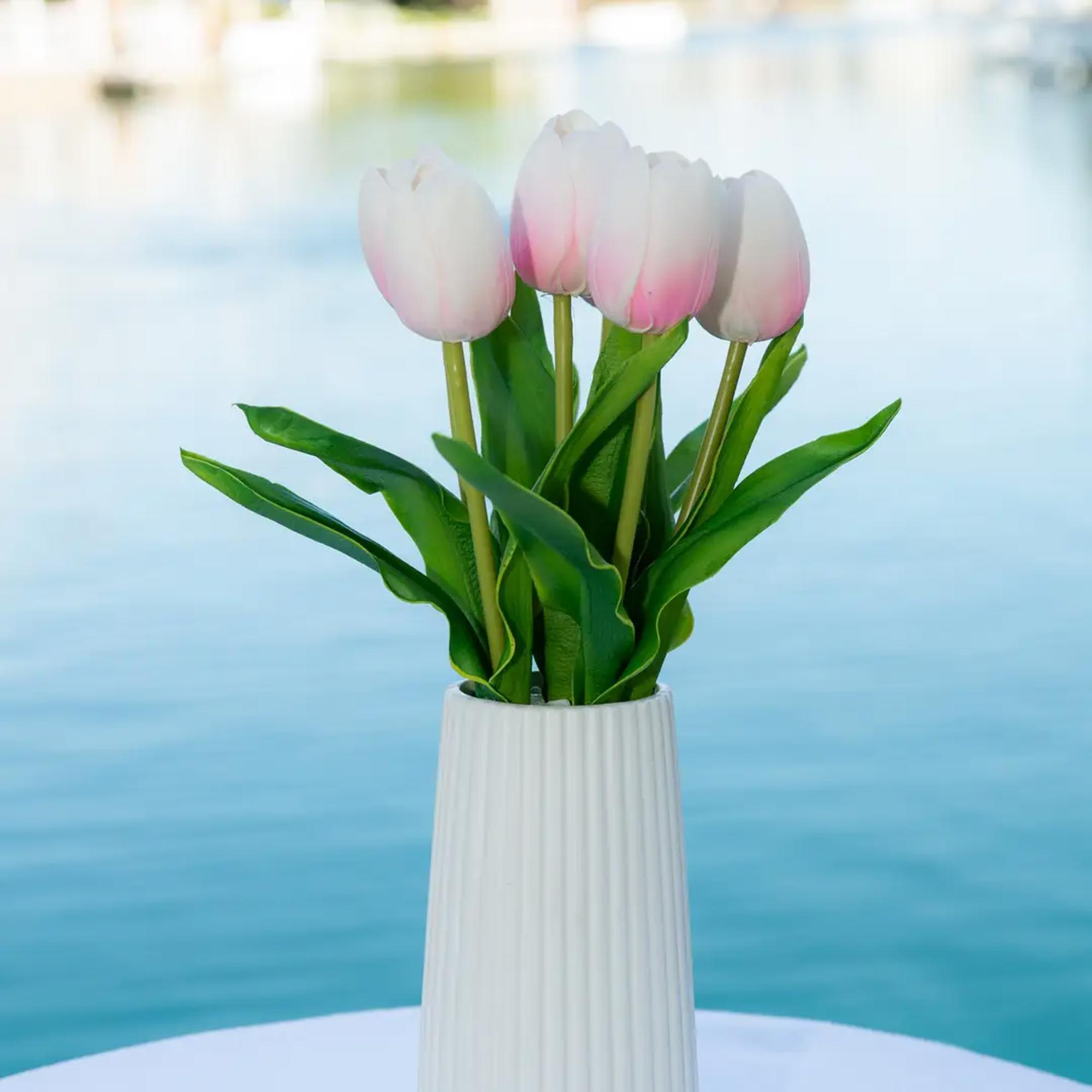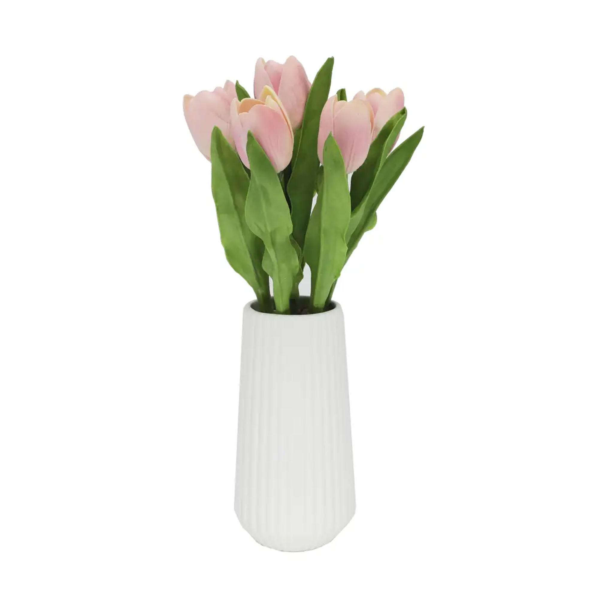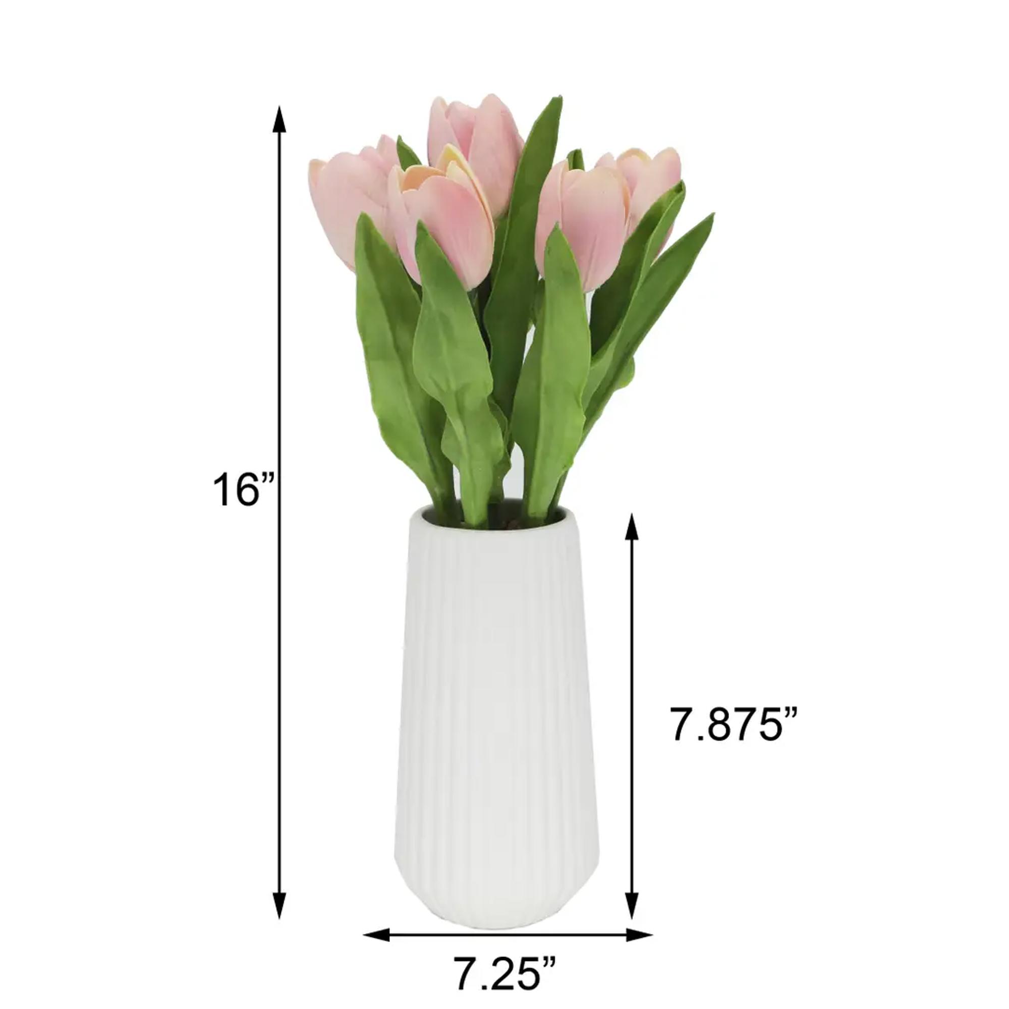 Bring a soft spring touch to any space with this Faux Tulip Arrangement, styled inside a sleek, white ribbed ceramic vase. The tall silhouette makes it ideal for centerpieces, entry tables, office desks, and boutique décor. With lifelike petals, flexible stems, and vibrant green leaves, it gives the look of freshly cut tulips — no watering or upkeep needed.