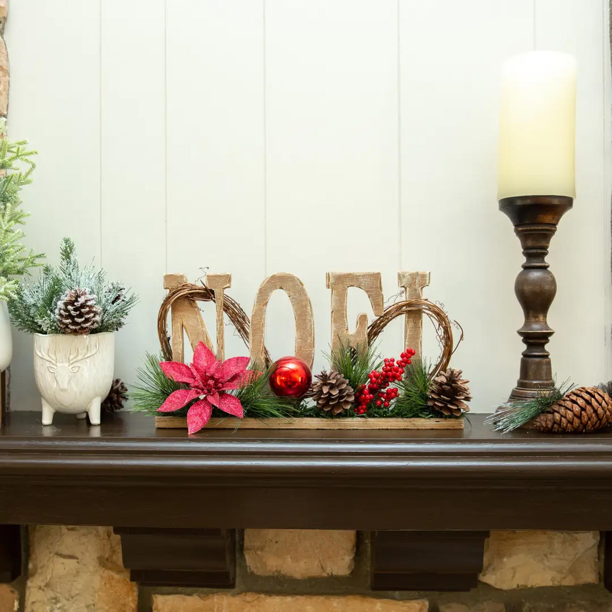 The wooden NOEL letters have a warm, handcrafted look, complemented by realistic faux pine branches, pinecones, red ornaments, and a glittered poinsettia for a classic Christmas touch. A wrapped vine detail adds organic texture, enhancing the natural holiday aesthetic.