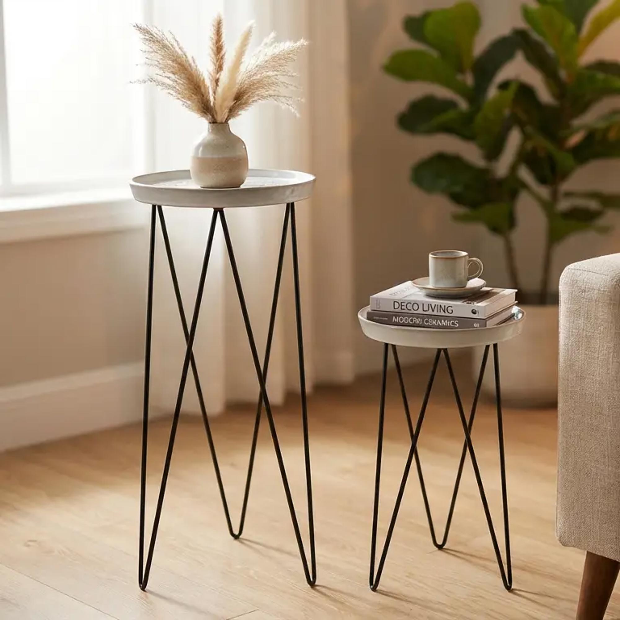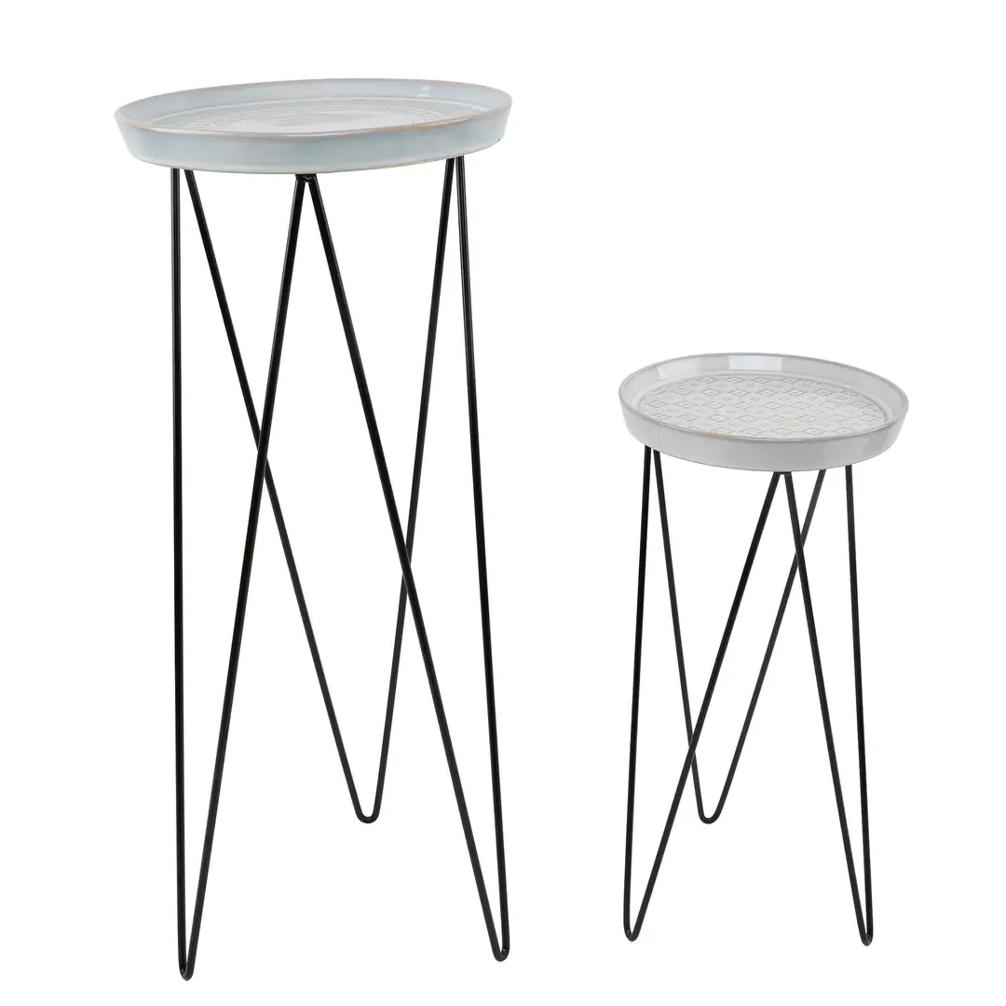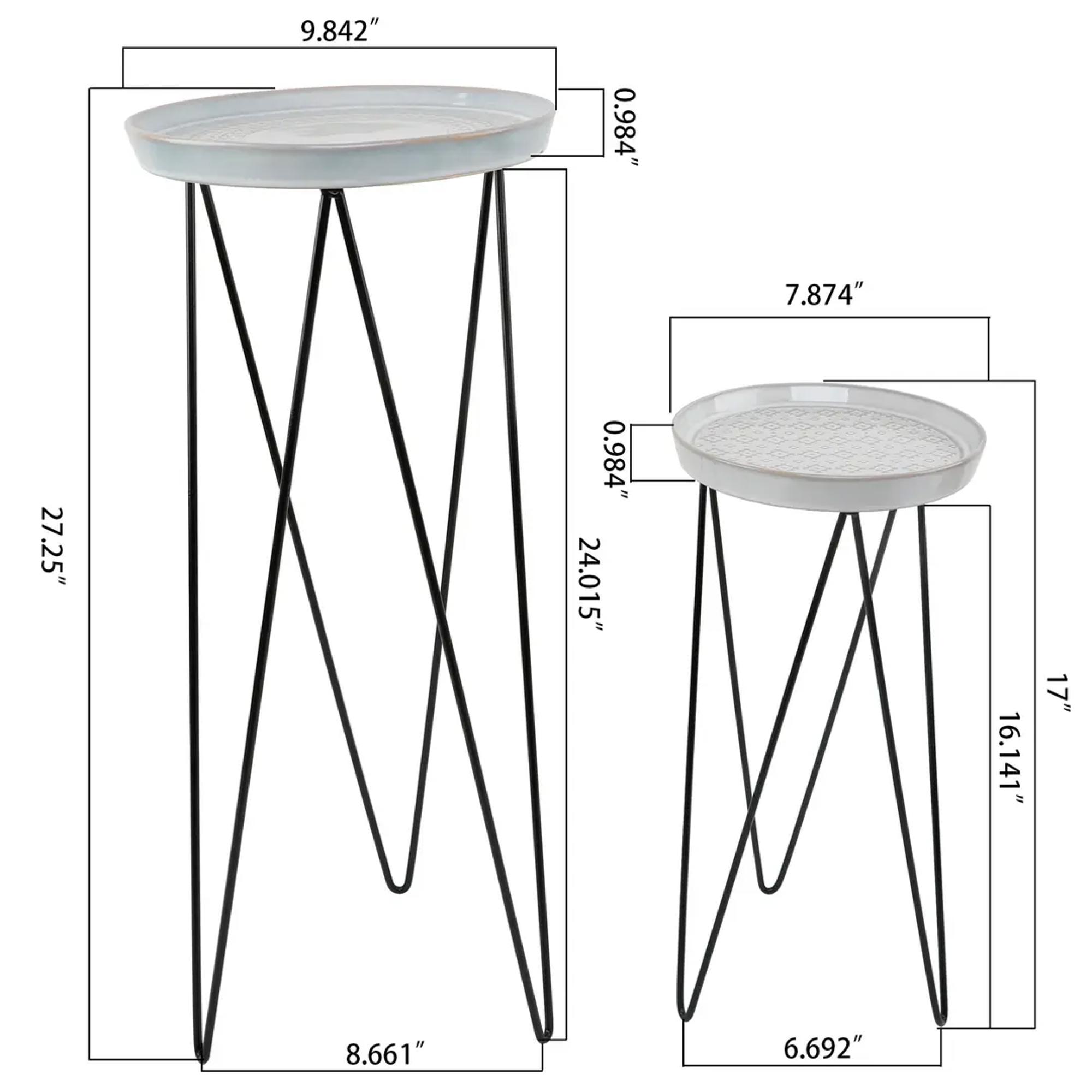 Elevate your home or retail displays with this Set of 2 Metal Accent Tables with Ceramic Tops, designed to add height, texture, and modern style to any room. Each table features a patterned ceramic tray-style top with a raised edge, paired with sleek black hairpin metal legs for a clean, sculptural look.