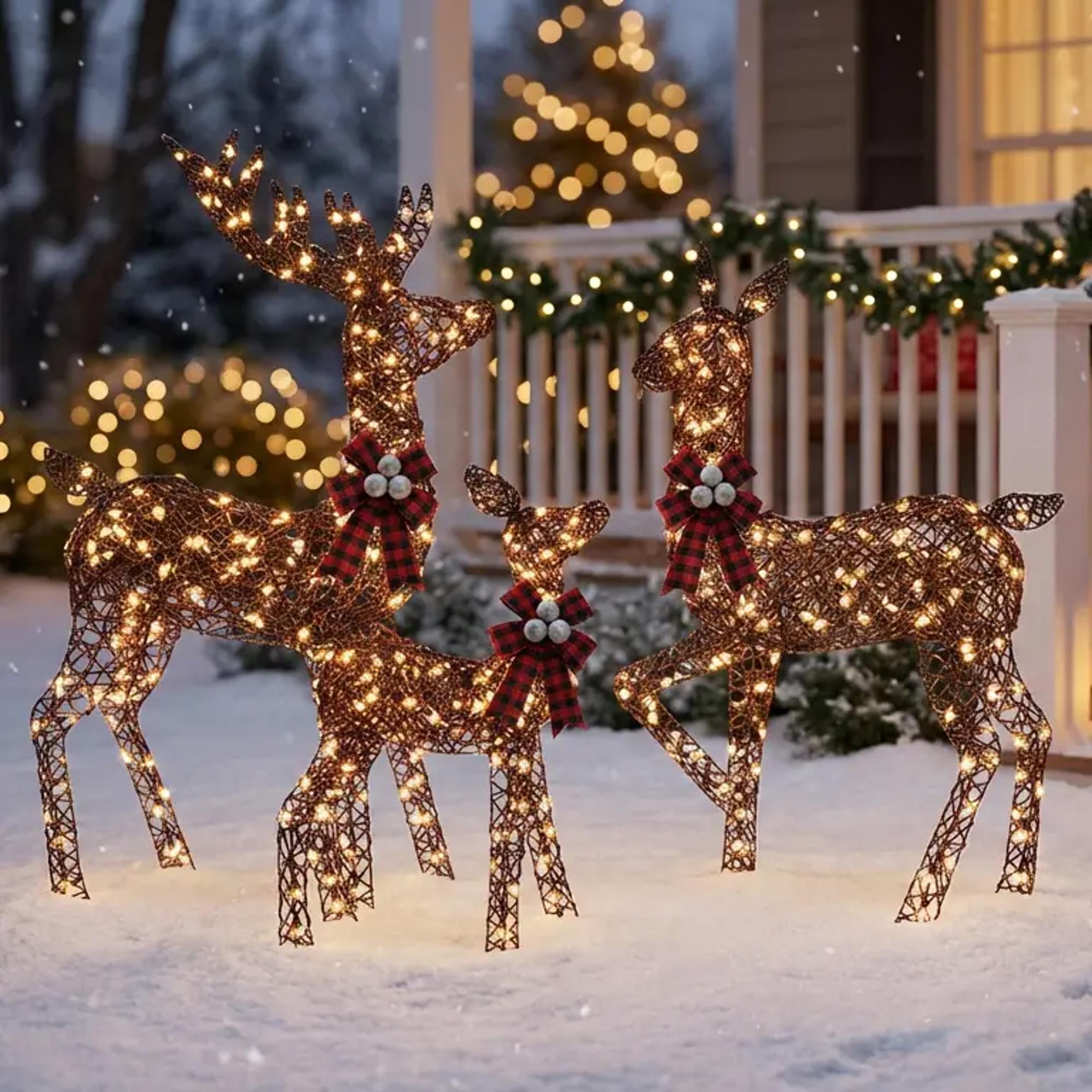 Bring elegance and warmth to your holiday display with this 3-Piece Large Lighted Christmas Deer Family Set. Crafted from durable brown rattan, this charming trio includes a majestic buck, graceful doe, and adorable fawn—all adorned with festive red plaid bows and glowing with 360 warm white LED lights. A beautiful way to illuminate your lawn or garden all season long.