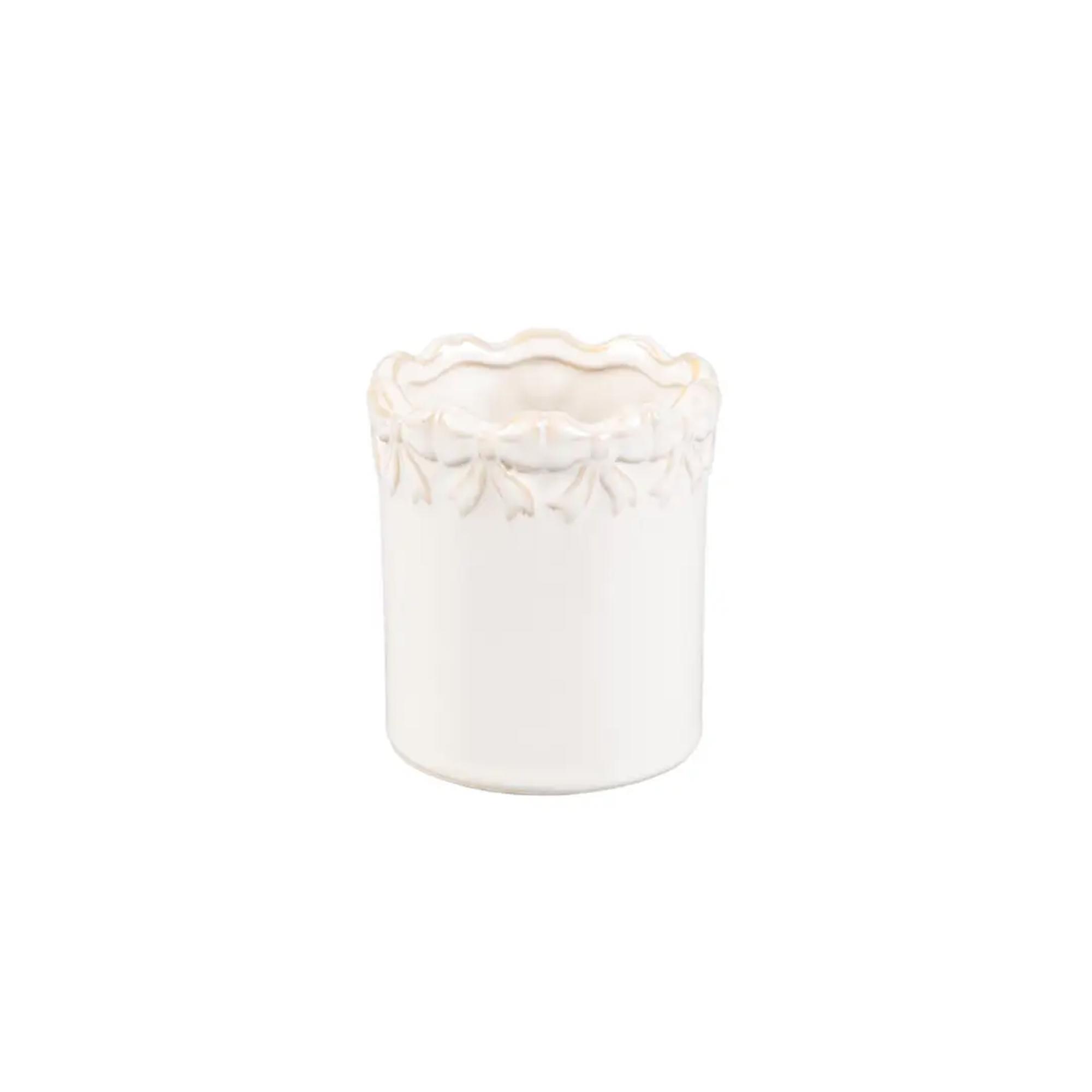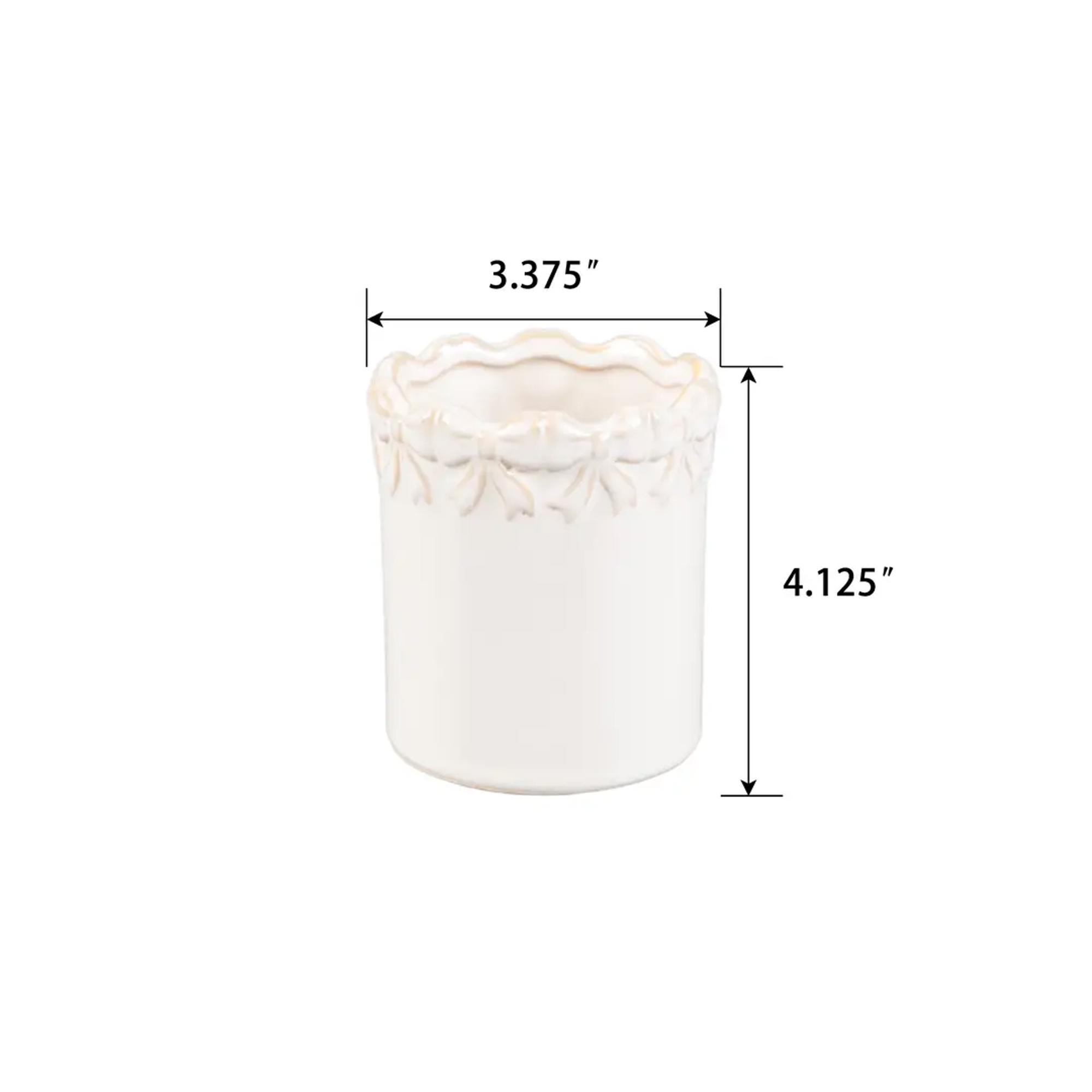 Measuring 5" x 5" x 4.125", it’s perfectly sized to hold pens, pencils, makeup brushes, paintbrushes, or floral stems, making it a versatile accessory for both décor and daily use. The sculpted bow design makes it ideal for styling feminine desk décor, bridal gift baskets, nursery shelves, and bookshelf vignettes.