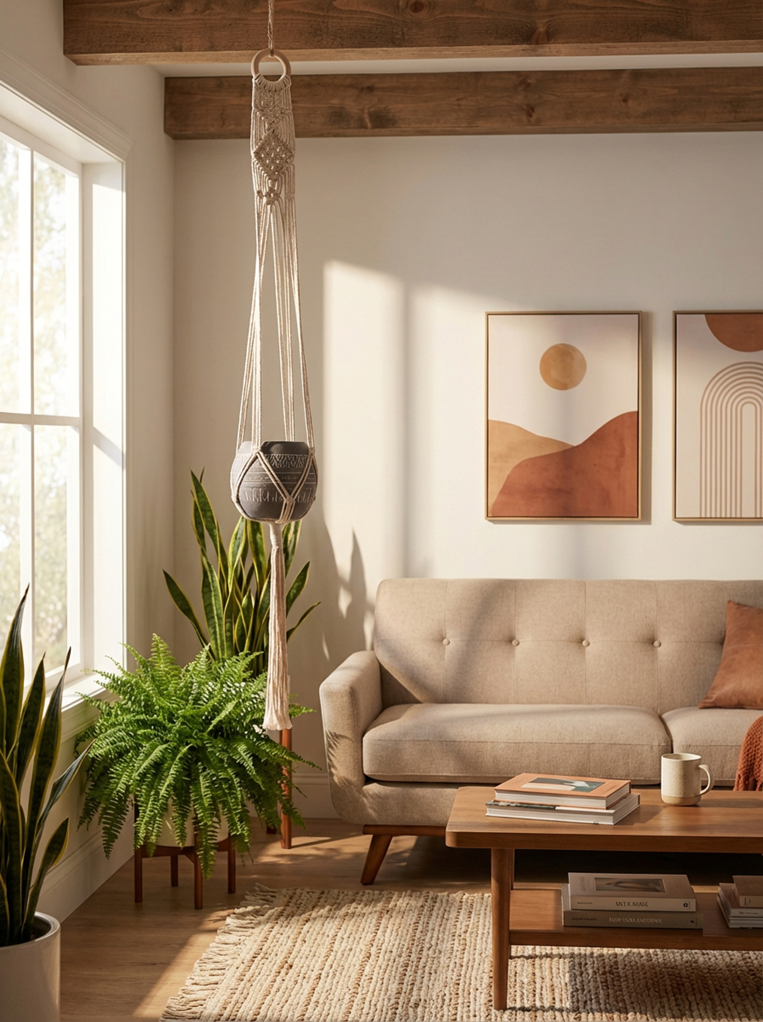 43" H Hanging Macrame With Aztec Ceramic Pot