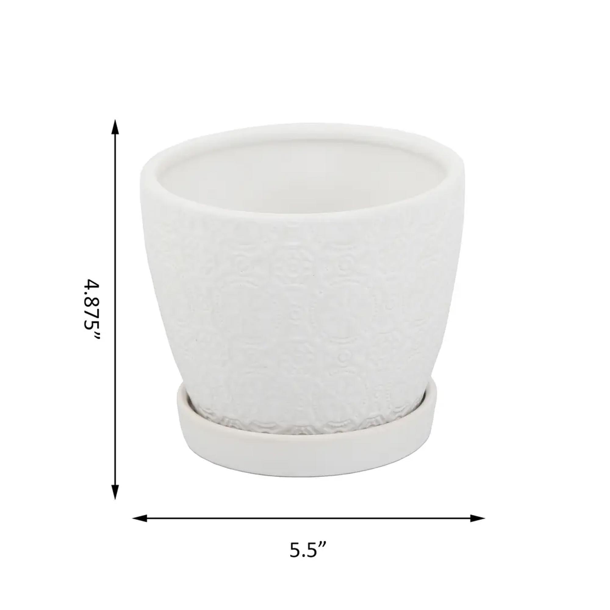 Measuring 5.5 inches wide and 4.875 inches tall, this compact pot is perfect for small houseplants, herbs, succulents, or decorative arrangements. The built-in drainage hole and included saucer help protect surfaces while promoting healthy plant growth, making it both beautiful and functional.