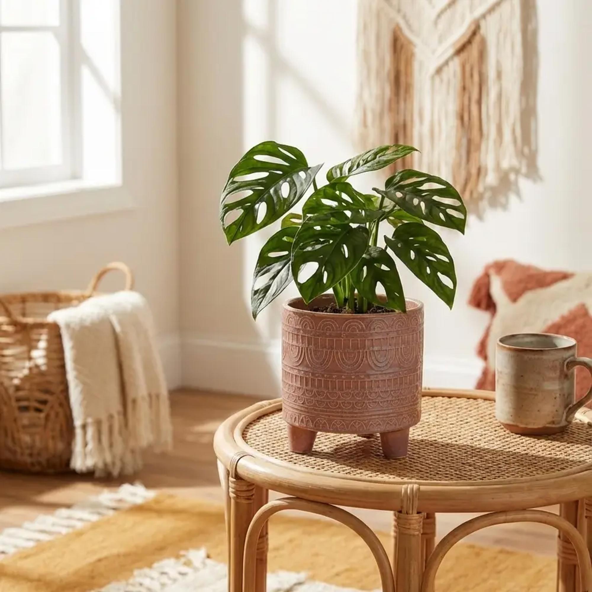 Bring warm, earthy charm to your space with this boho-inspired terracotta ceramic planter. Designed with an intricate raised geometric pattern, this piece combines artisanal texture with a rich, clay-toned finish that complements both neutral and colorful décor. The footed base gives it a lifted profile, adding height and presence on shelves, side tables, consoles, or window sills.