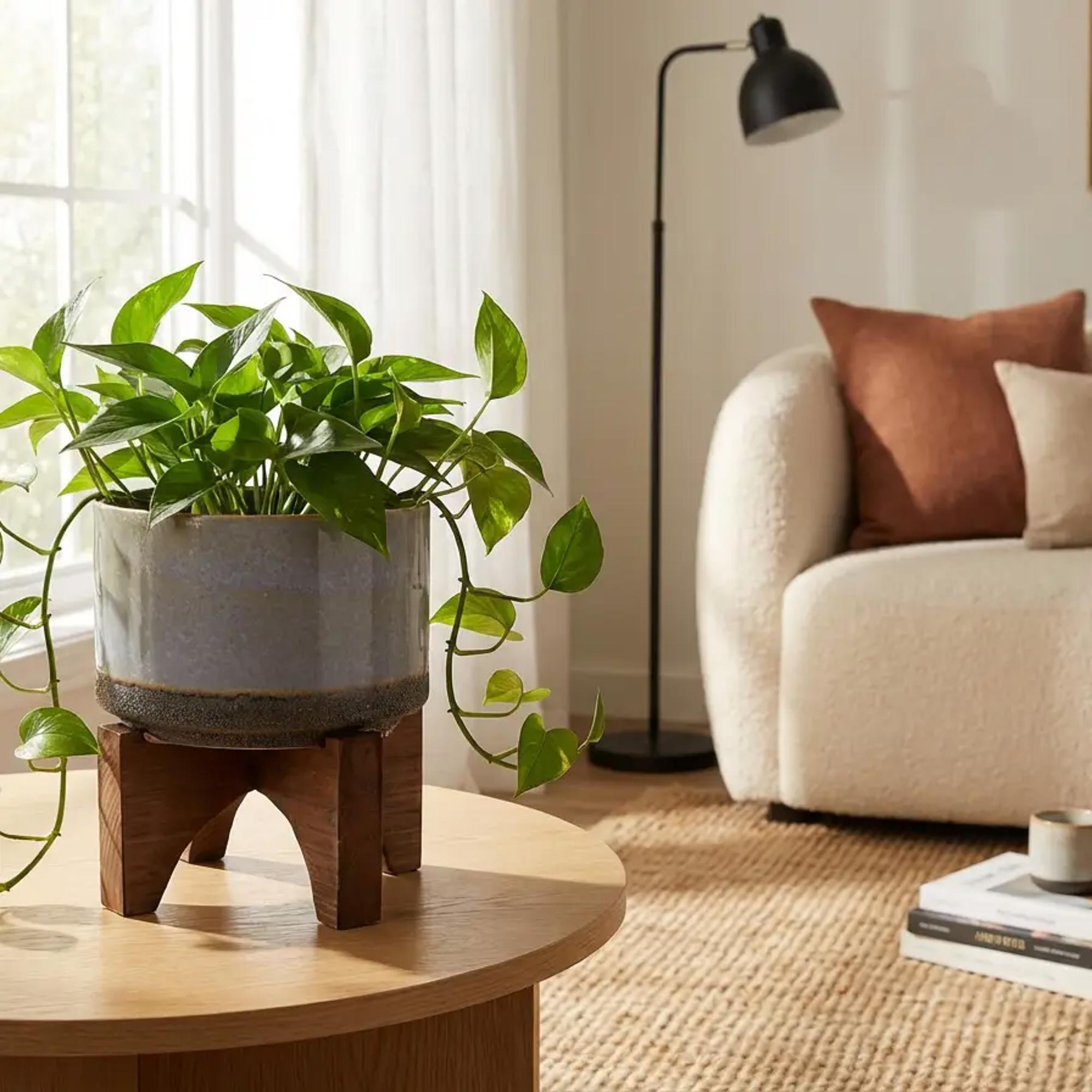 The ceramic pot measures 7.5" wide and 4.5" tall, and when paired with the natural wood stand, the total height reaches 8.125". This elevated design gives your plants added presence on shelves, consoles, countertops, and side tables. Ideal for medium houseplants, succulents, herbs, or faux greenery, this planter combines durability with visual appeal.