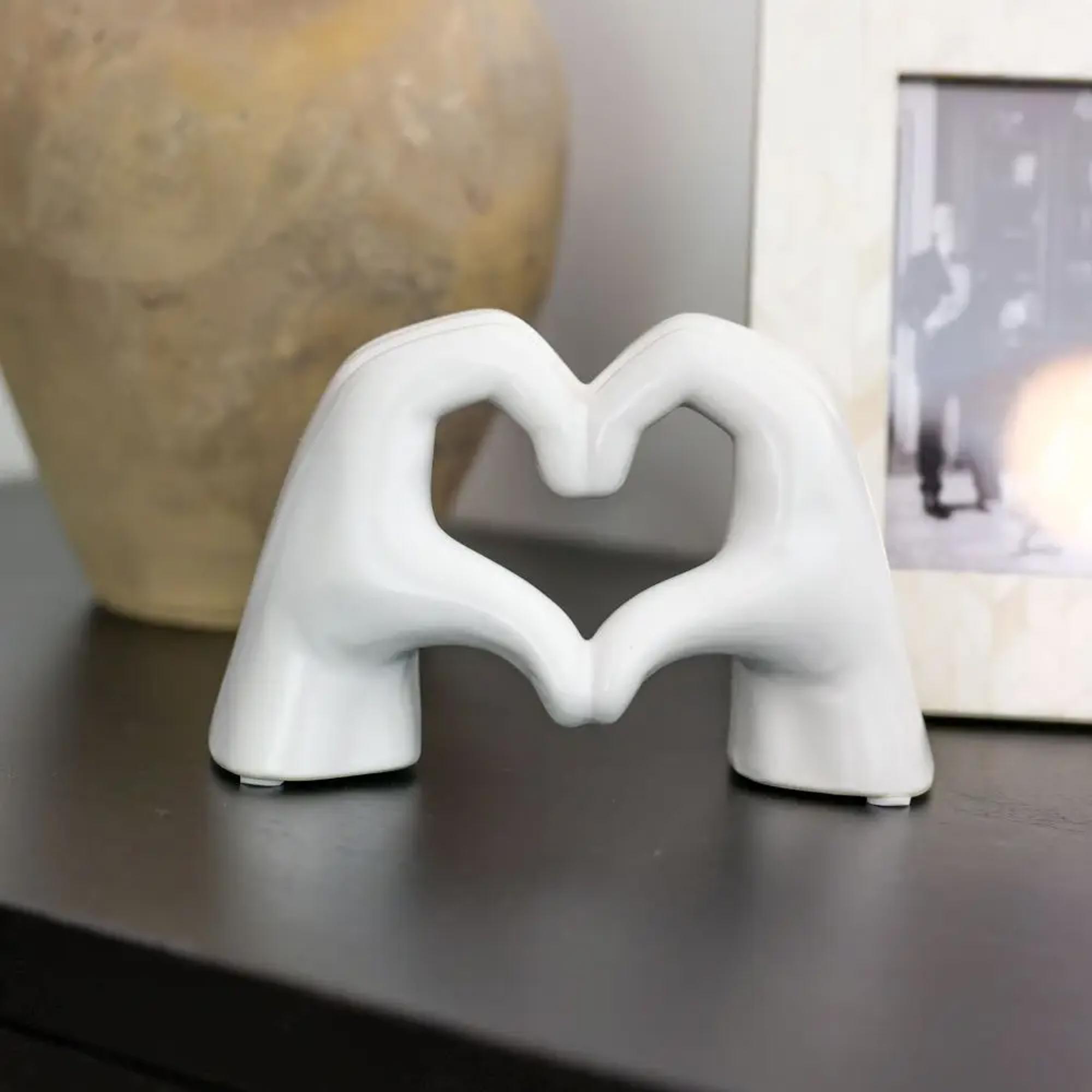 Celebrate love, connection, and meaningful moments with this elegant Ceramic Heart Hands Figurine. Designed in a glossy white finish, the intertwined hands form a perfect heart shape—symbolizing unity, friendship, and affection. With its modern sculptural look and smooth curves, this decorative piece adds a heartfelt touch to any room.