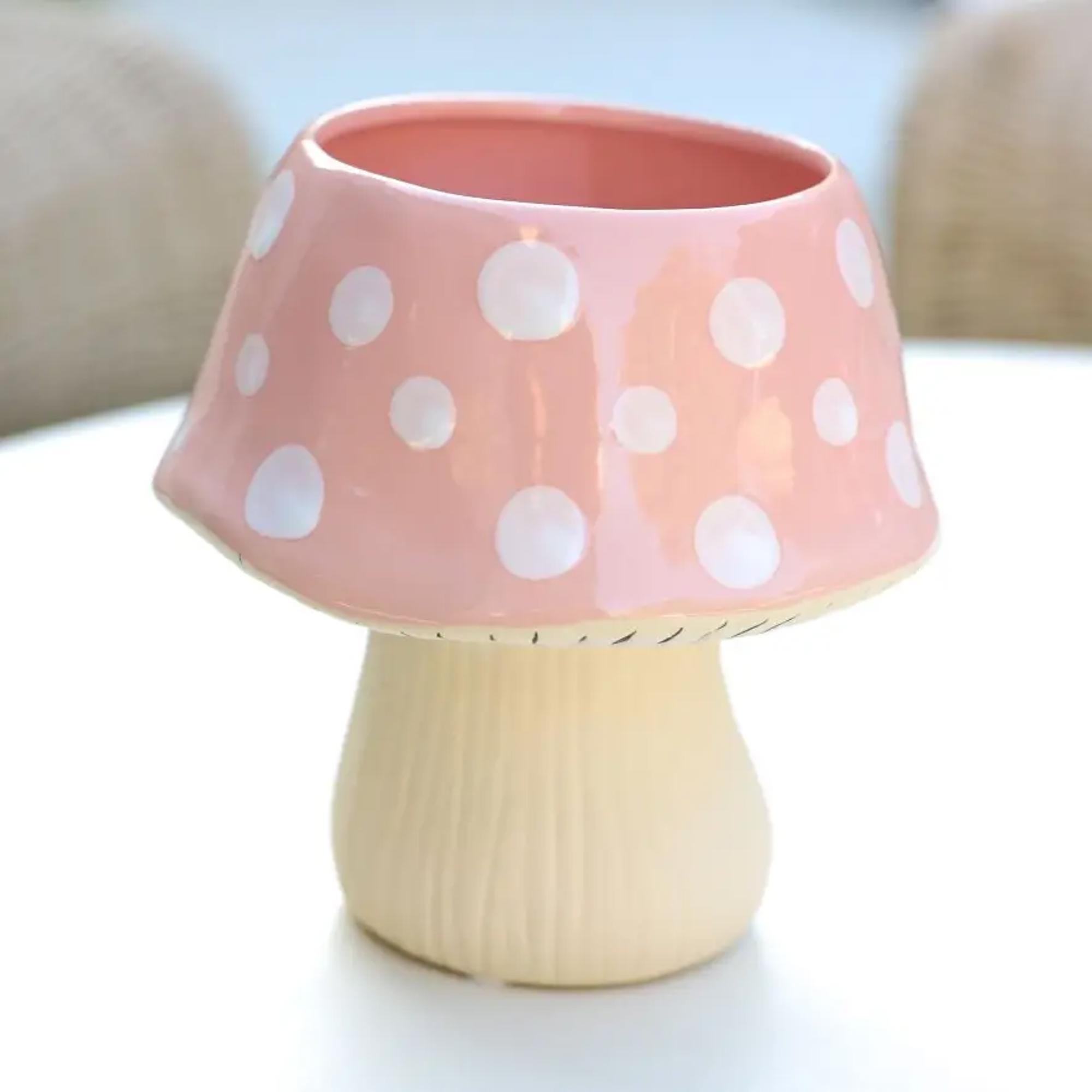 Bring whimsical charm to your plant display with this Pink Polka Dot Mushroom Ceramic Planter. Shaped like an adorable oversized mushroom, this planter features a glossy pink cap decorated with playful white polka dots and a textured cream-colored stem that mimics the look of a real mushroom. Its enchanting design adds personality, warmth, and a touch of fairytale magic to any space.