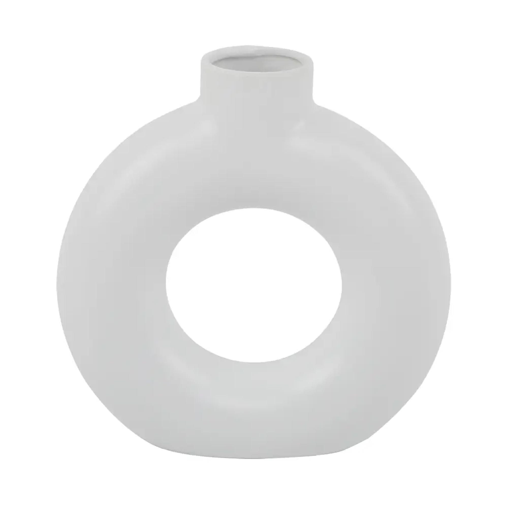 Elevate your décor with this modern White Donut Ceramic Vase, designed with a sculptural round silhouette and open center that adds an instant touch of contemporary style. Its matte white finish pairs beautifully with any color palette, making it a versatile accent for minimalist, Scandinavian, boho, and modern interiors.