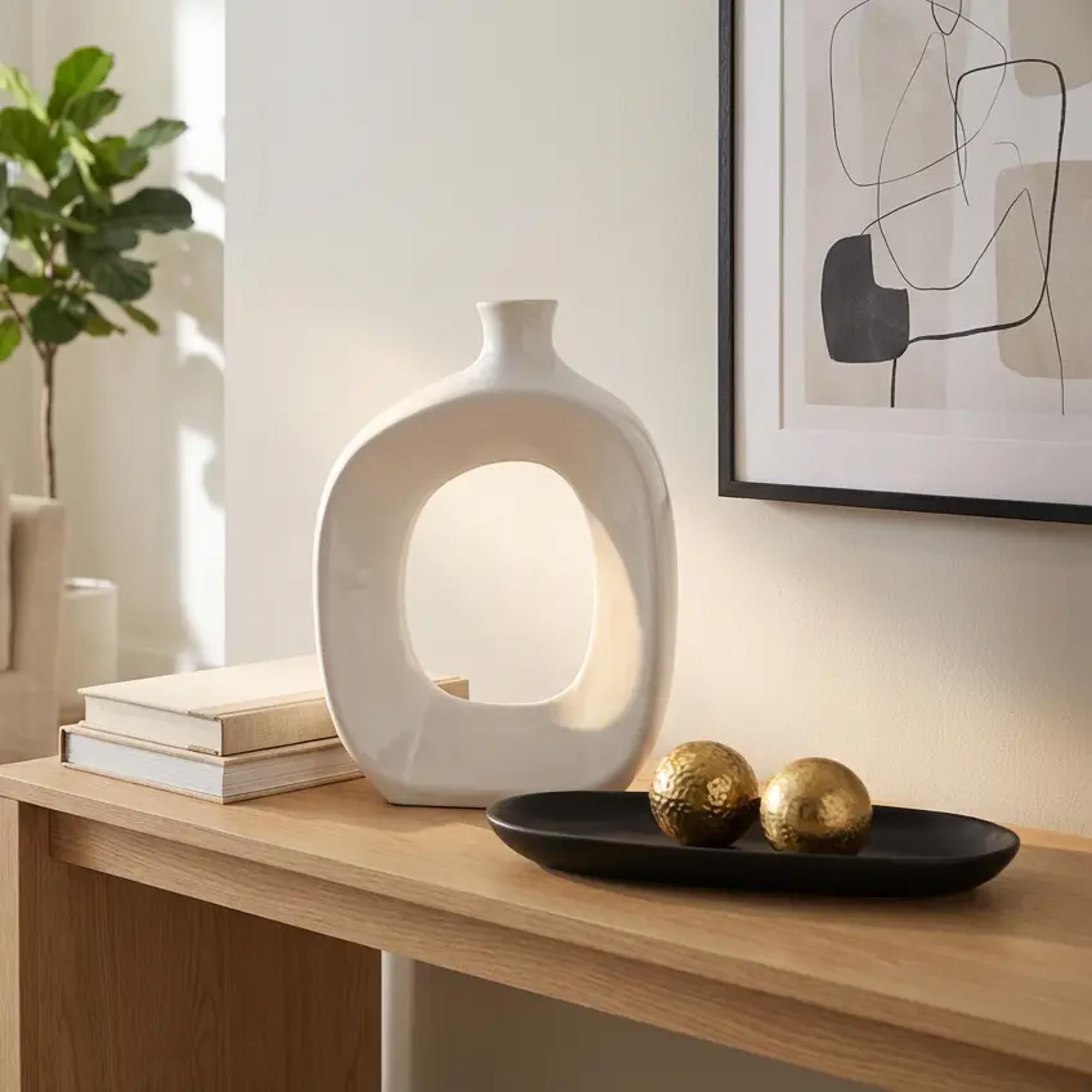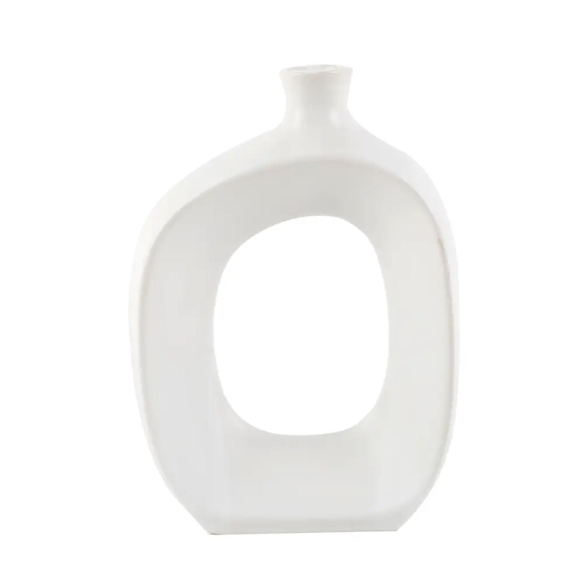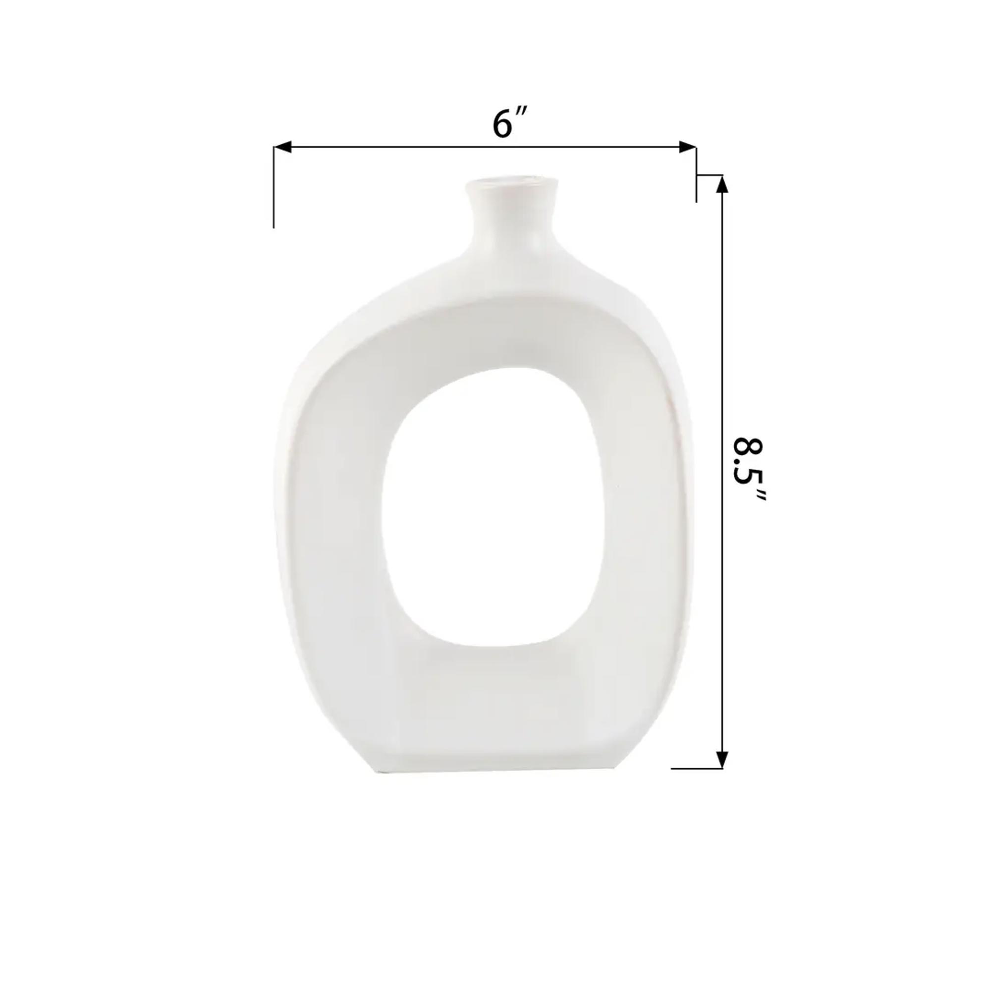 Elevate your décor with this Modern Open Circle Ceramic Vase, featuring a sculptural hollow-center design that brings a touch of contemporary artistry to any space. With its clean white finish and minimalist silhouette, this vase effortlessly complements modern, Scandinavian, boho, and coastal décor styles.