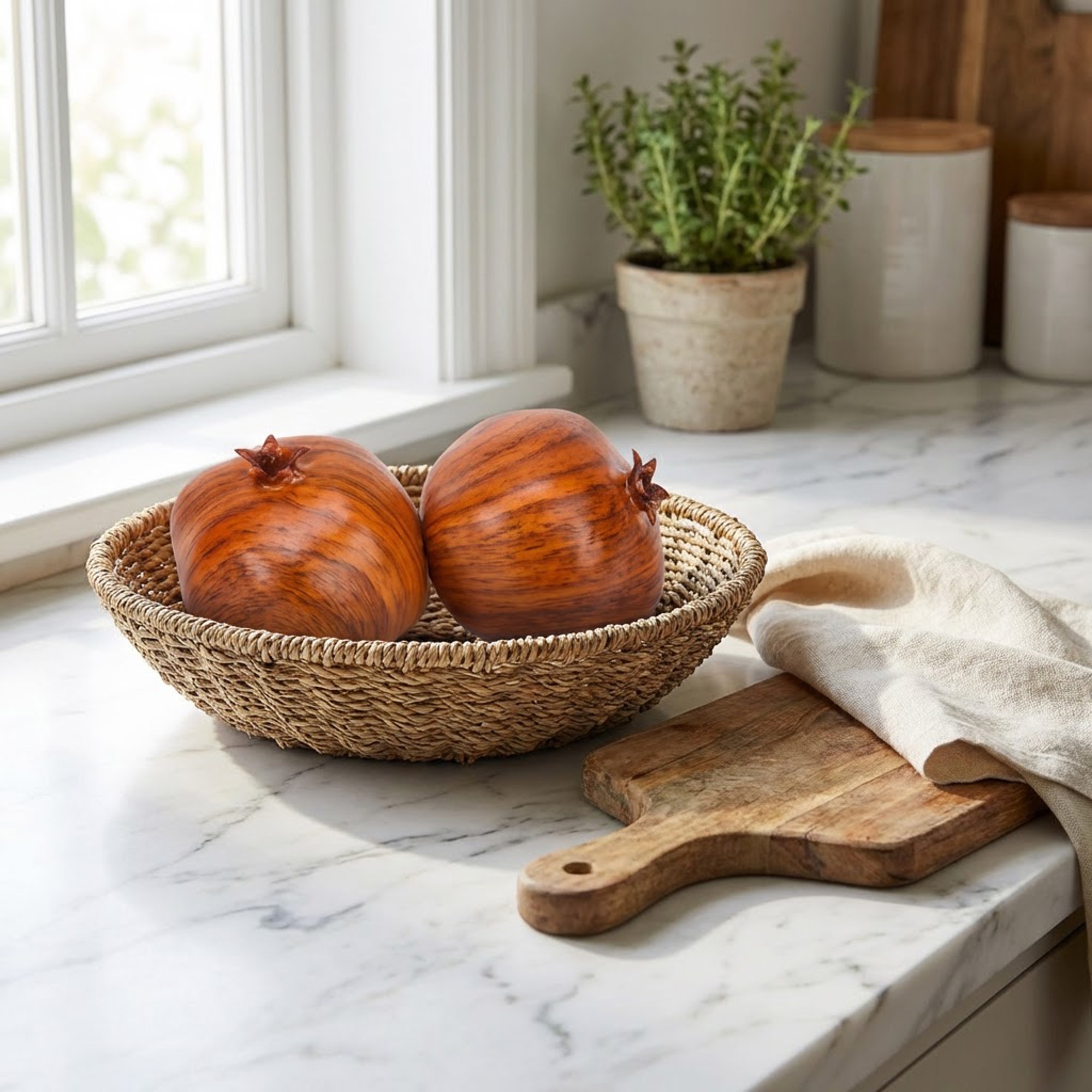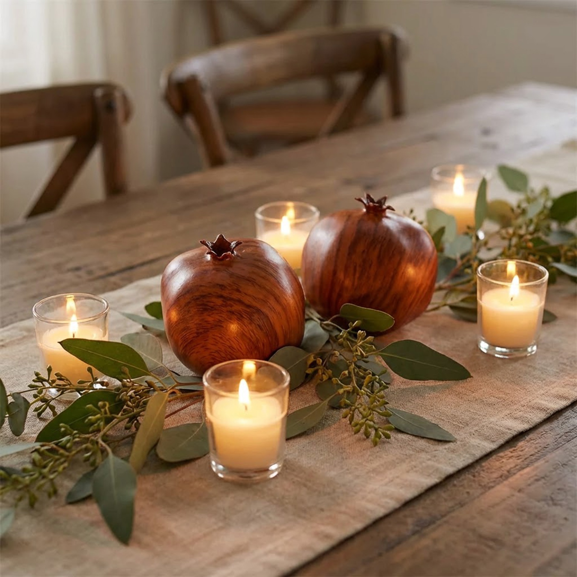 Its warm red and golden tones make it a perfect accent for fall décor, harvest displays, kitchen bowls, dining tables, shelves, and centerpieces. Whether styled alone or paired with other faux fruits, this decorative pomegranate adds depth and visual interest to farmhouse, Mediterranean, and modern home aesthetics.