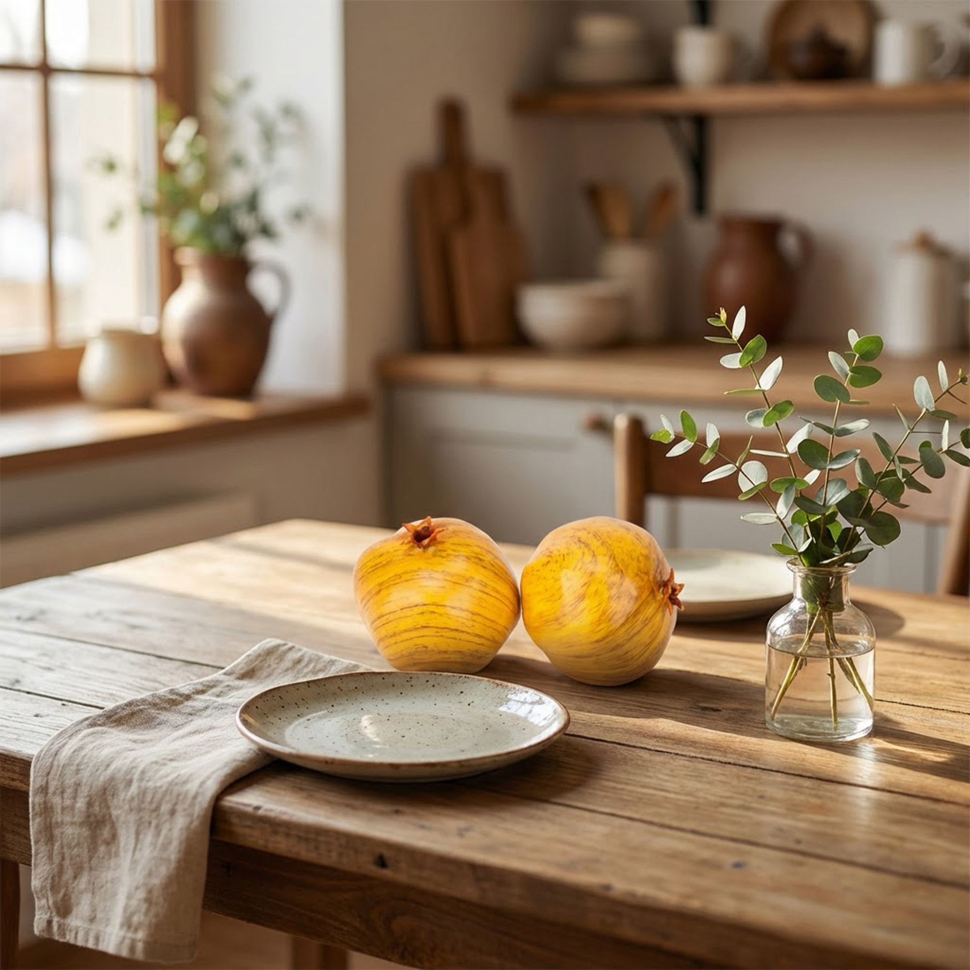 Its warm red and golden tones make it a perfect accent for fall décor, harvest displays, kitchen bowls, dining tables, shelves, and centerpieces. Whether styled alone or paired with other faux fruits, this decorative pomegranate adds depth and visual interest to farmhouse, Mediterranean, and modern home aesthetics.