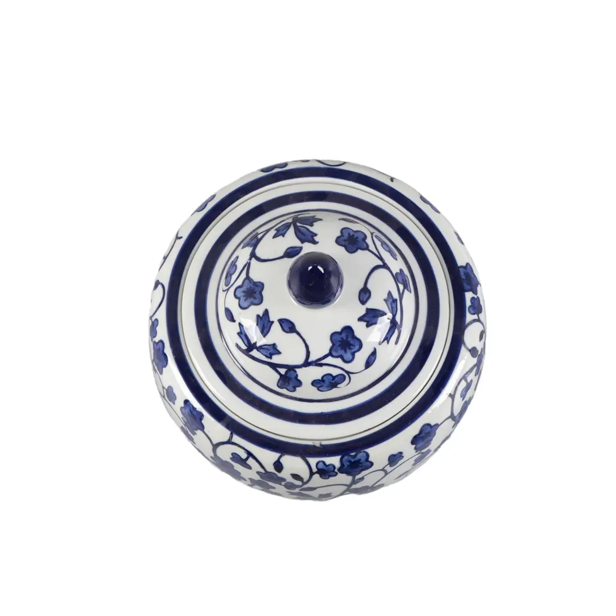 Bring timeless elegance to your décor with this Blue & White Floral Ceramic Ginger Jar. Designed with classic chinoiserie-inspired motifs, this lidded jar features delicate blue blossoms and leafy vines painted on a crisp white ceramic base. Its rounded silhouette and pointed lid finial add traditional charm while still fitting beautifully into modern, coastal, farmhouse, and transitional interiors.