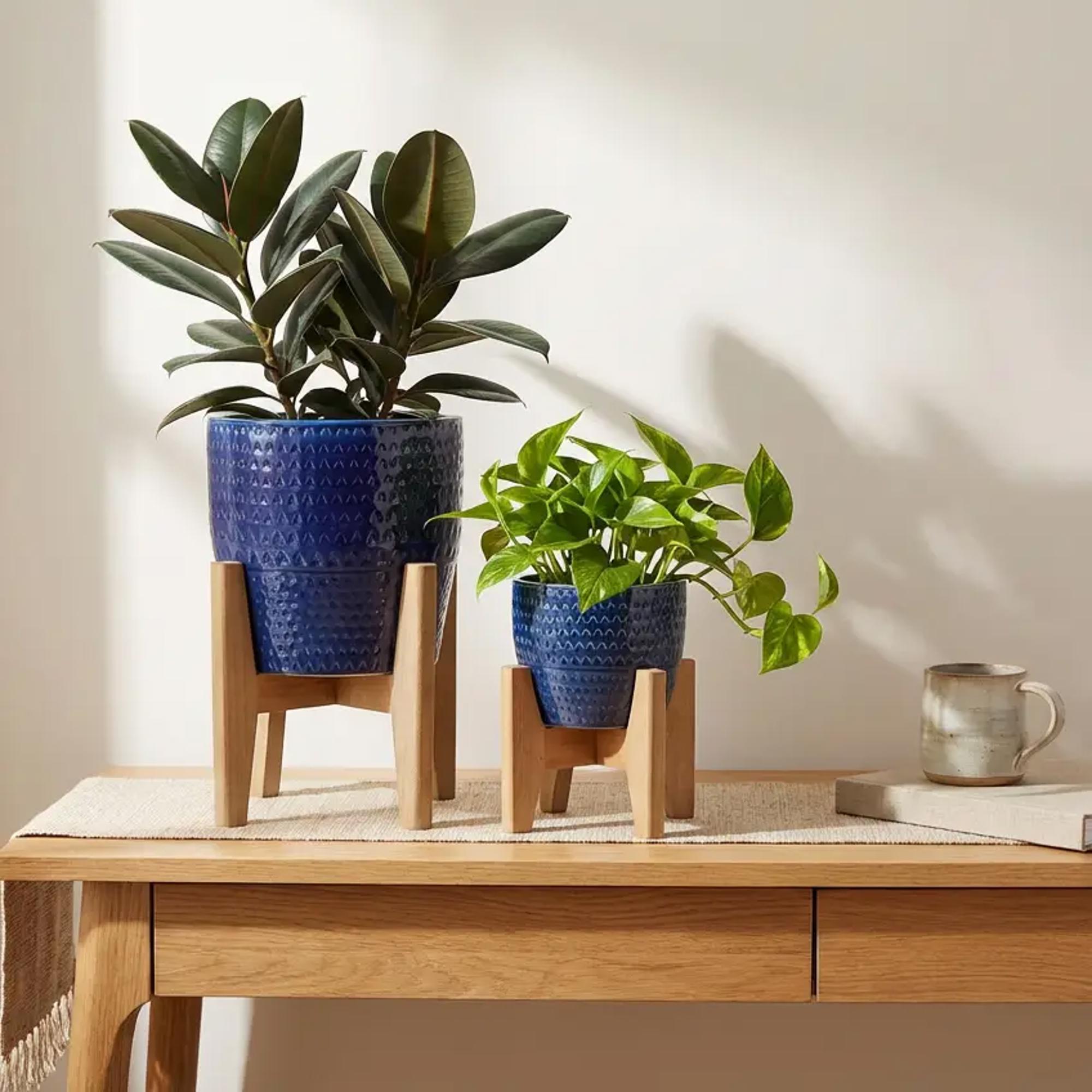 Bring bold, modern style to any space with this Set of 2 Blue Textured Ceramic Planters with Wooden Stands. Featuring a rich navy glaze and an embossed geometric pattern, these planters add depth and visual interest to your plant displays. Each planter includes a sturdy natural wooden stand, offering height, stability, and a clean, contemporary look.