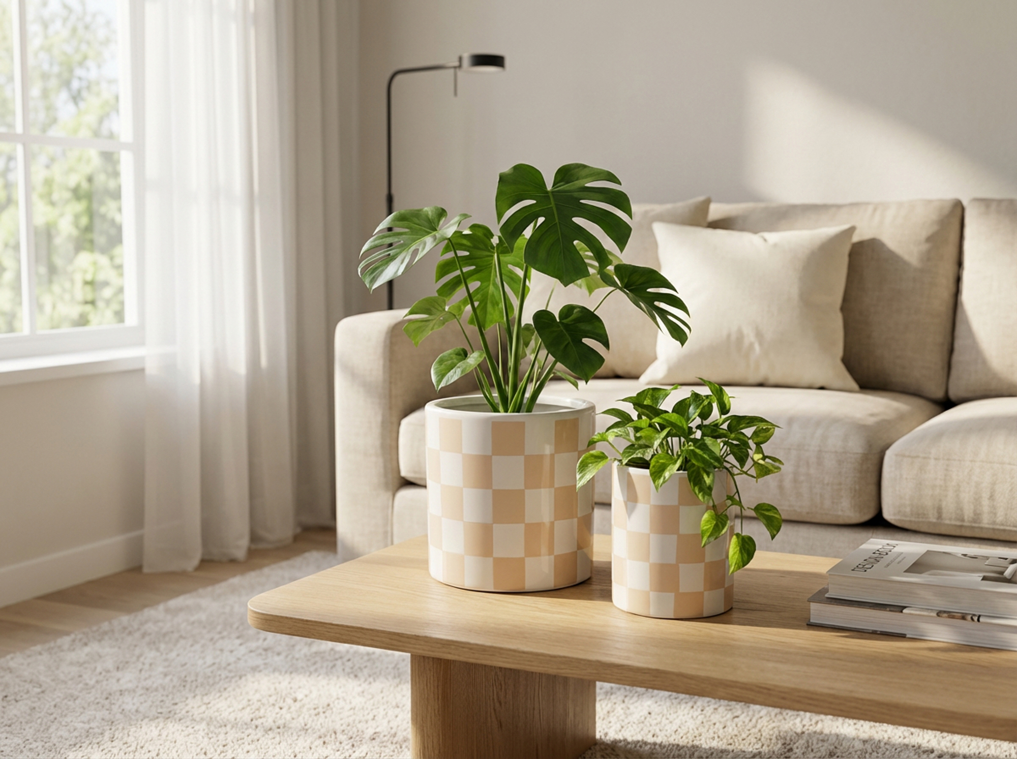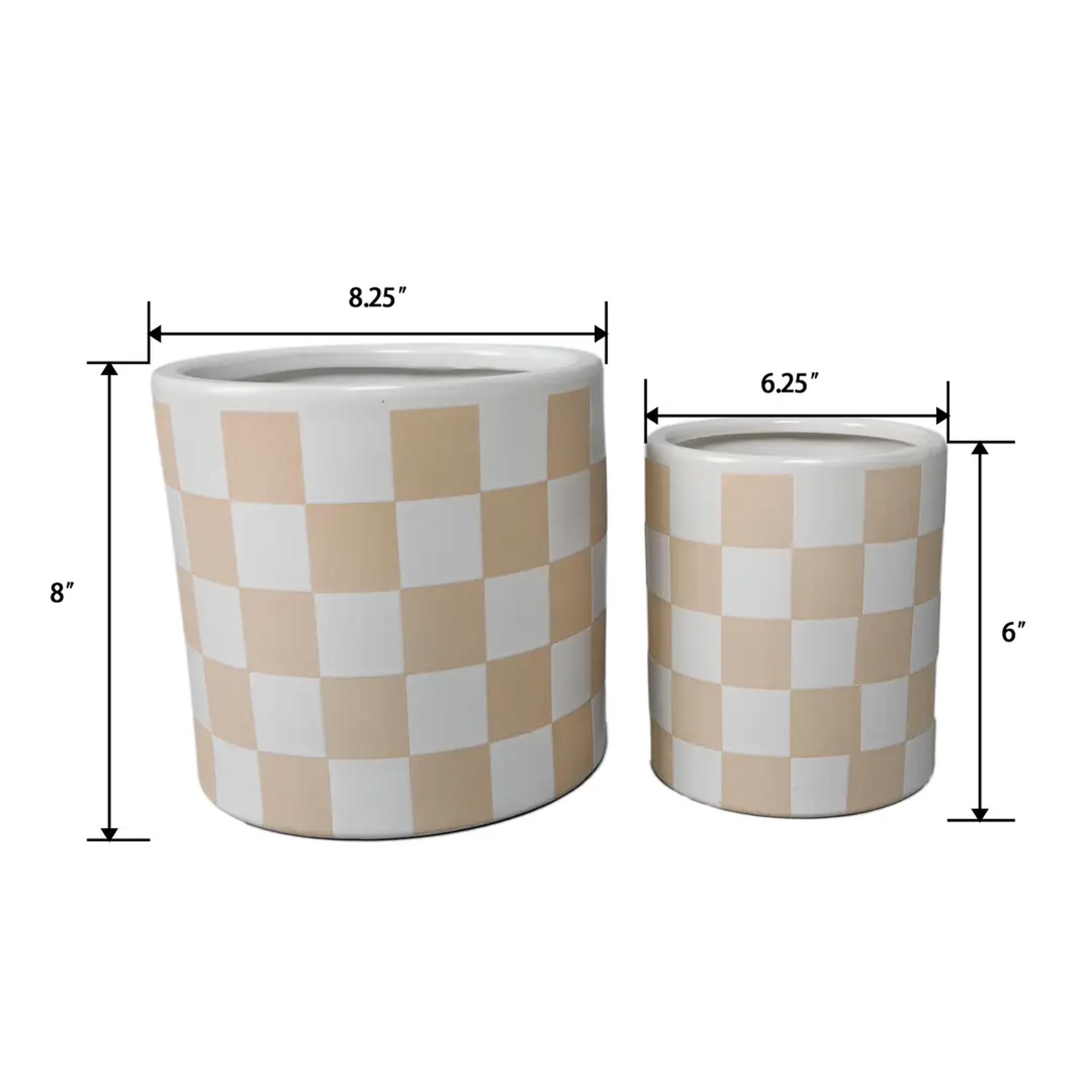 Set of 2, 8.25" & 6.25" Beige Checkered Ceramic Pots