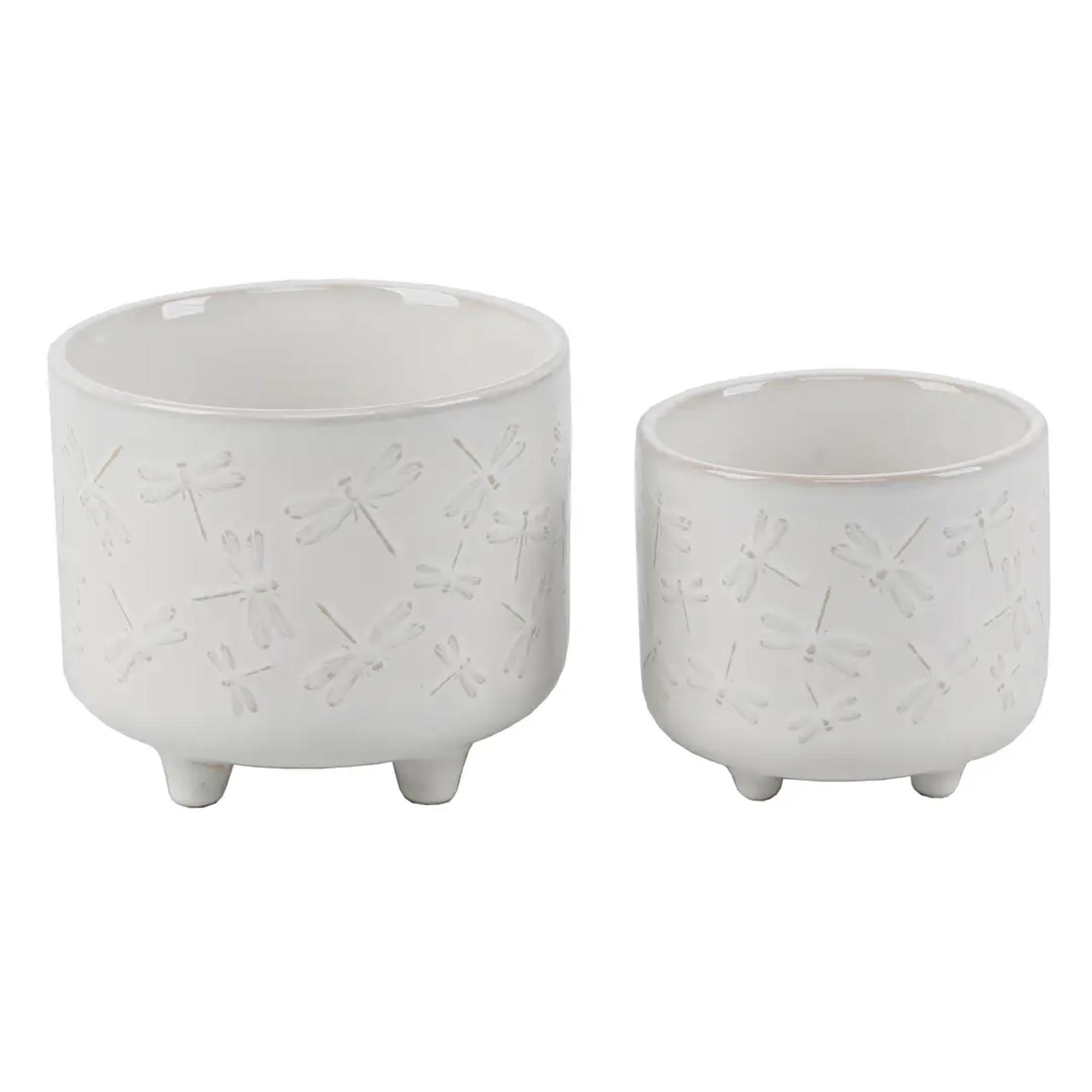 Bring a touch of whimsy and lightness to your décor with this Dragonfly Embossed Footed Ceramic Planter Set. Adorned with delicately raised dragonfly motifs, each planter captures the airy, nature-inspired charm of these graceful creatures. The clean white ceramic finish pairs beautifully with modern, farmhouse, cottagecore, and minimalist spaces, creating a soft and uplifting display wherever placed.