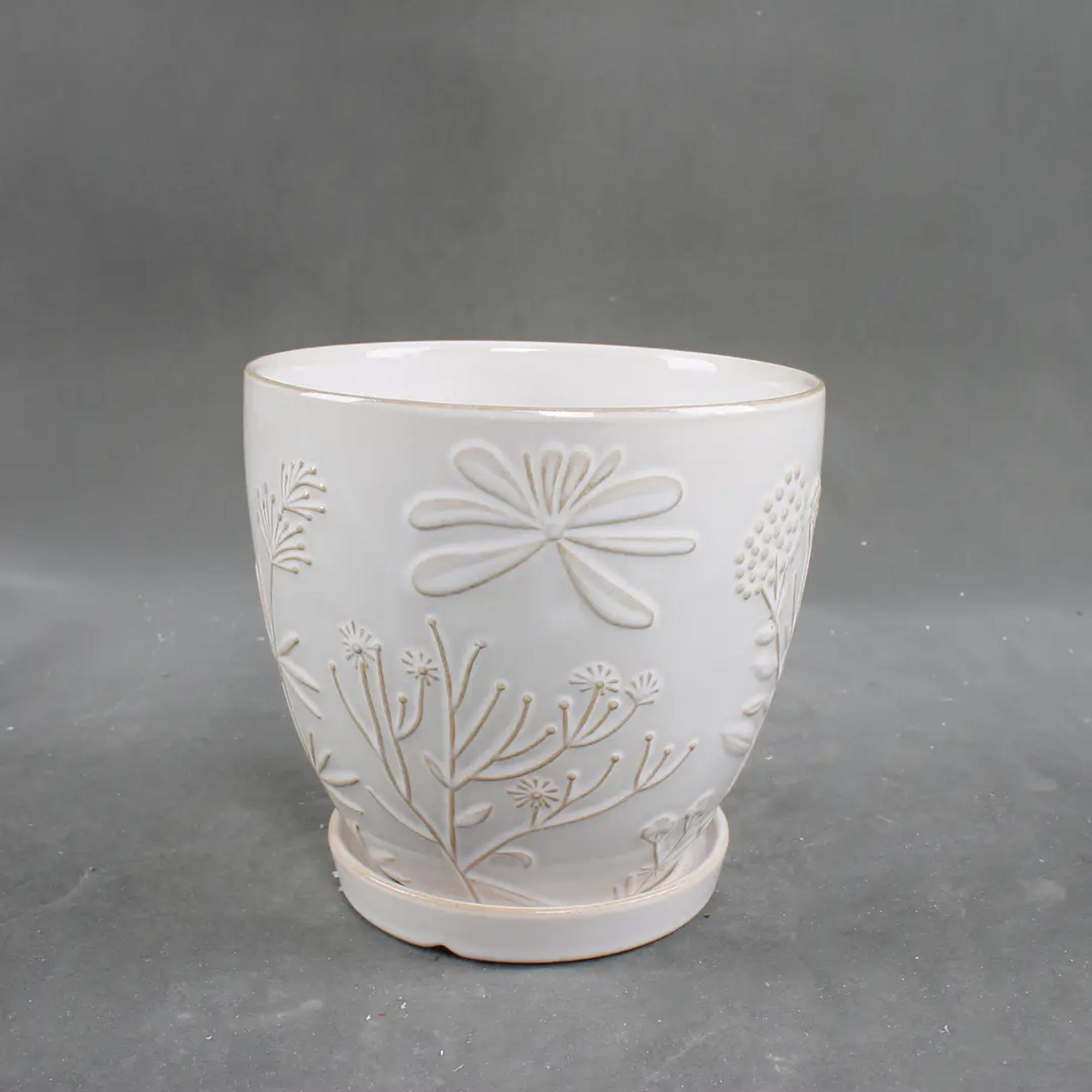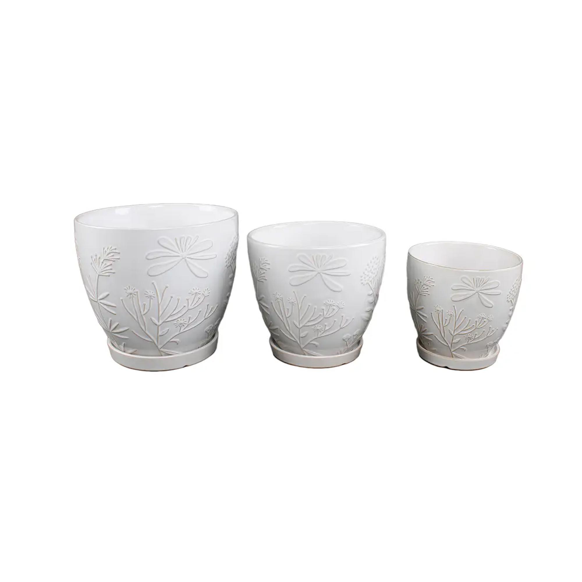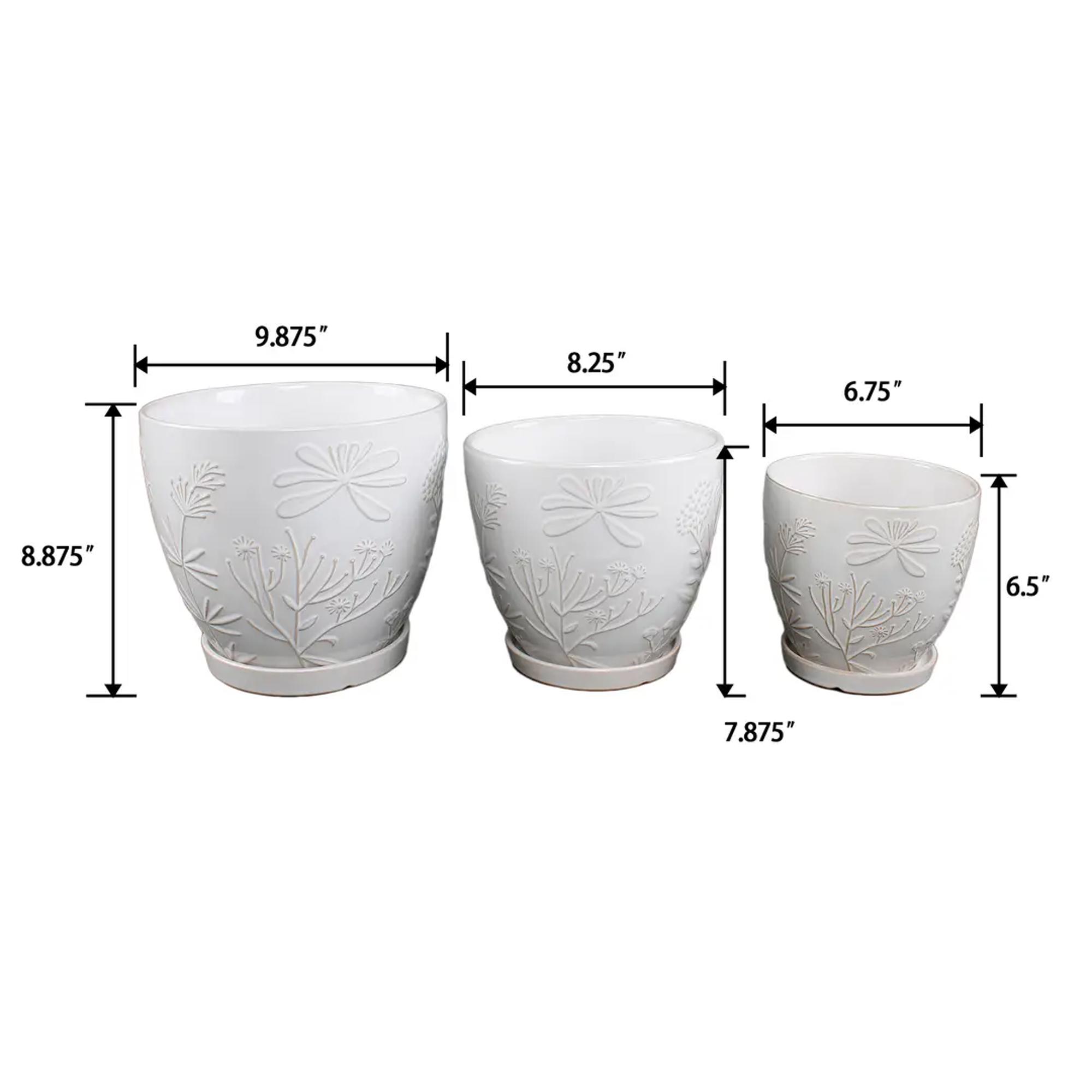 Set of 3 Ivory 10",8“,6.75” Jungle Flowers Ceramic Pots on Saucer
