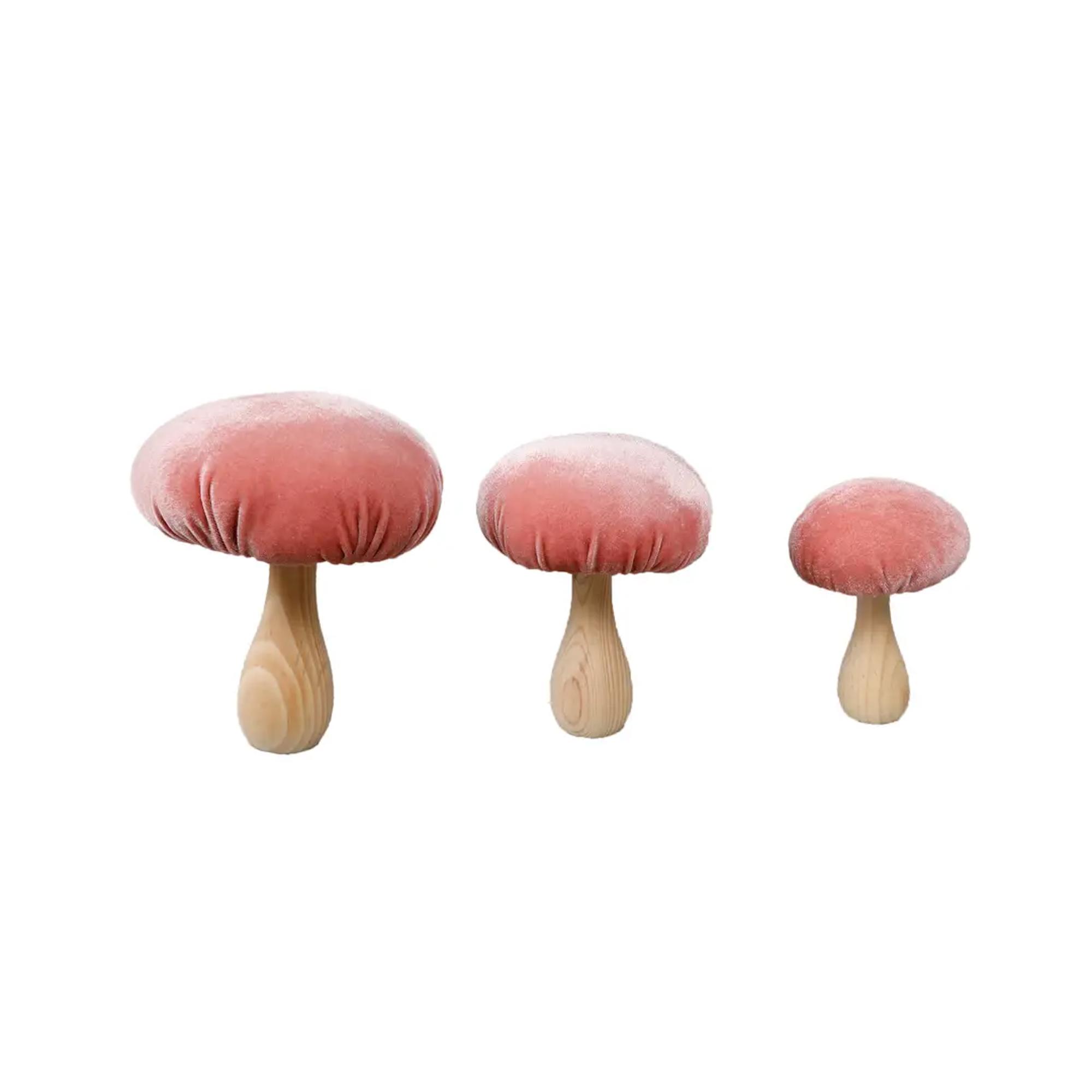 Bring whimsy, softness, and a cozy woodland touch to any space with this Set of 3 Velvet Mushrooms, featuring plush velvet caps and natural-look wooden stems. These decorative mushrooms are a charming accent for shelves, mantles, tiered trays, nursery décor, holiday décor, fairy garden displays, and boutique gift merchandising.