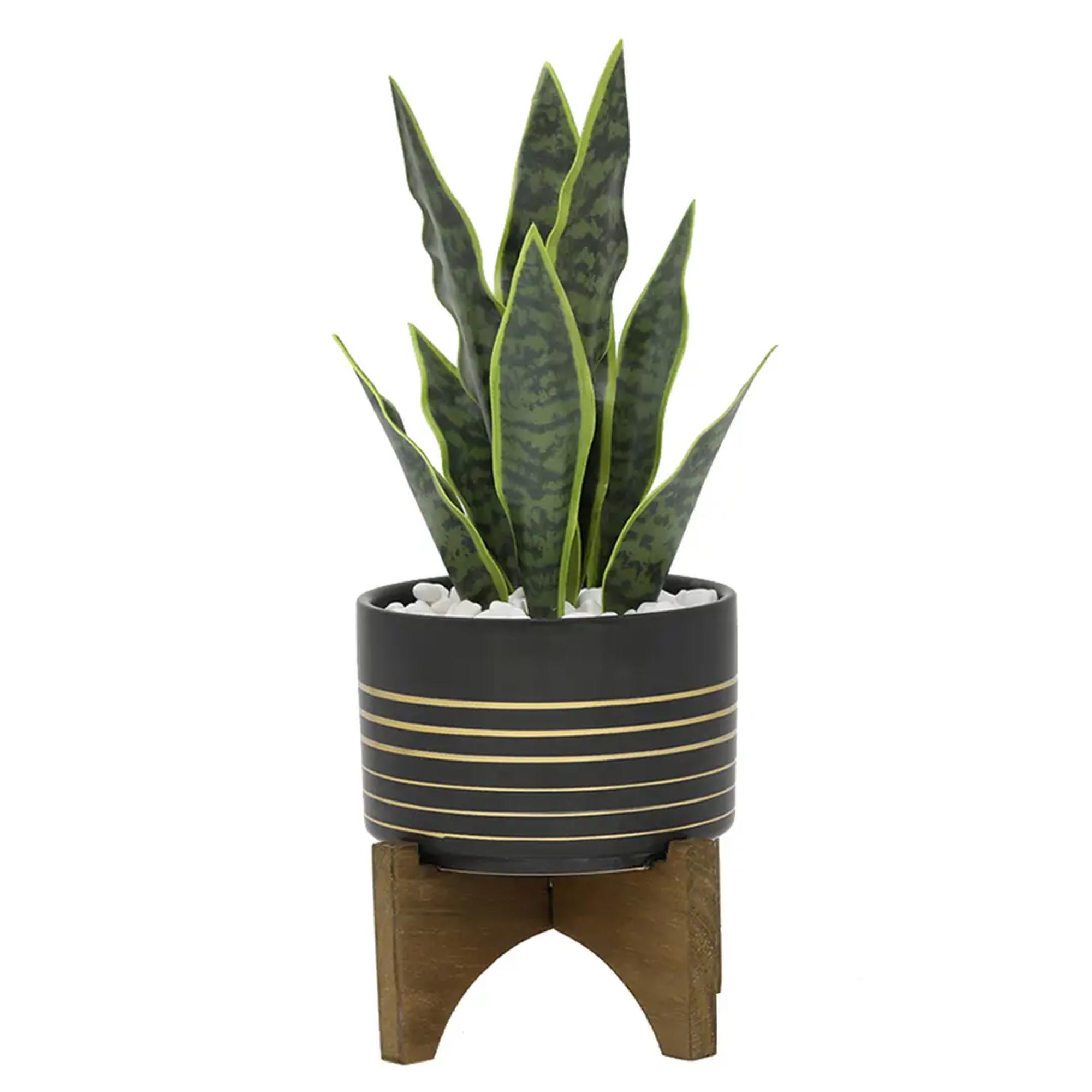 Bring effortless greenery and modern style to any space with this 12” Faux Snake Plant in Ceramic Pot with Wood Stand. Featuring lifelike sansevieria leaves and a clean, minimalist ceramic pot, this piece delivers the perfect blend of simplicity and contemporary décor—ideal for boutiques, gift shops, plant stores, and home décor retailers looking for reliable, fast-selling accents.