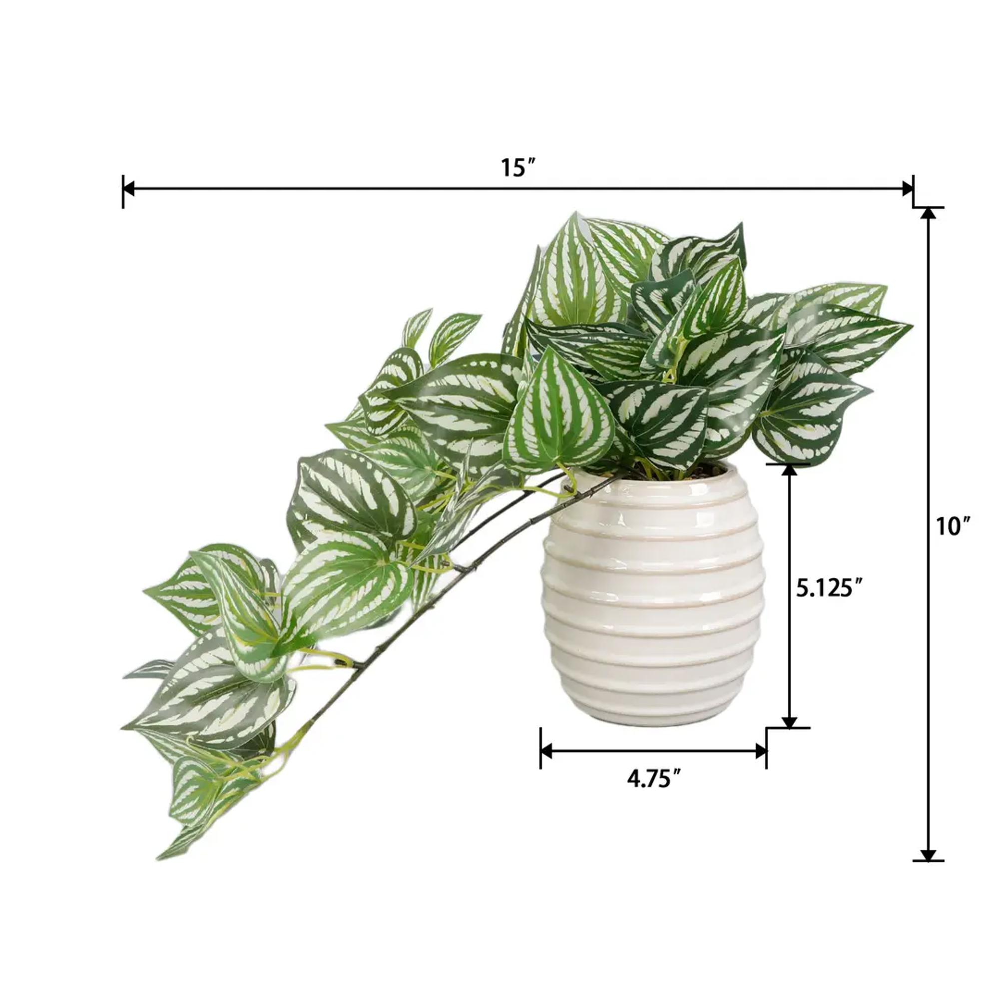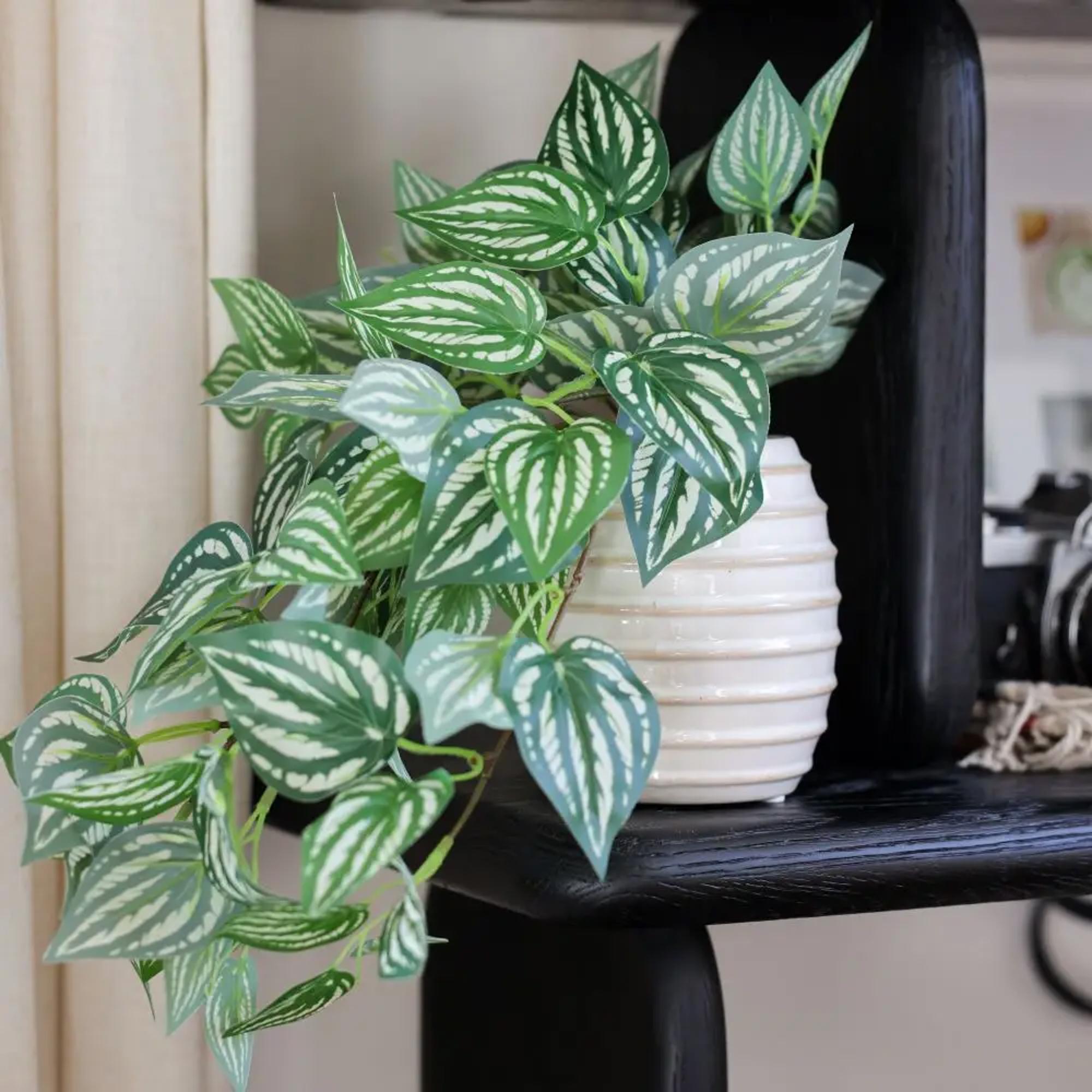Elevate your space with this lush trailing faux Peperomia, arranged in a creamy ribbed ceramic pot for a clean, modern finish. The realistic cascading vine effect instantly adds dimension—perfect for shelves, consoles, kitchen counters, floating wall ledges, or workspace décor where a touch of greenery makes all the difference.