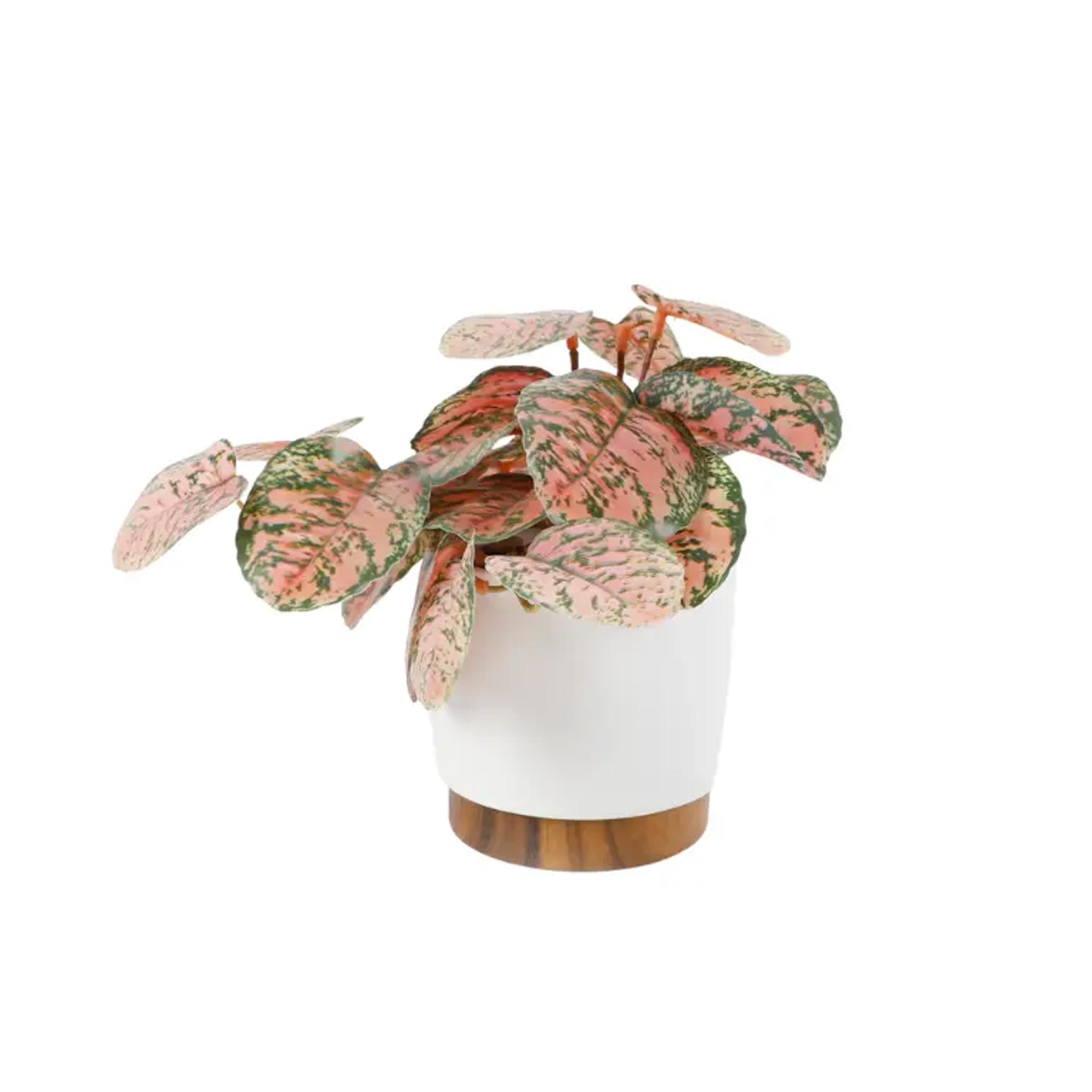 Brighten up shelves, entry tables, kitchens, and boutique displays with this soft-touch faux Polka-Dot plant in shades of blush pink and green. Styled inside a smooth matte-white ceramic pot resting on a warm wood pedestal, it adds a modern-natural touch while keeping maintenance to zero.