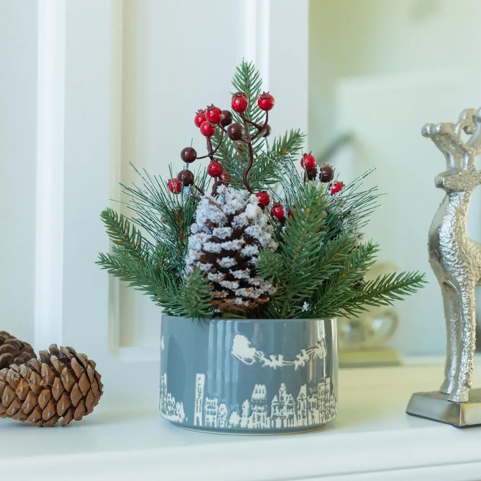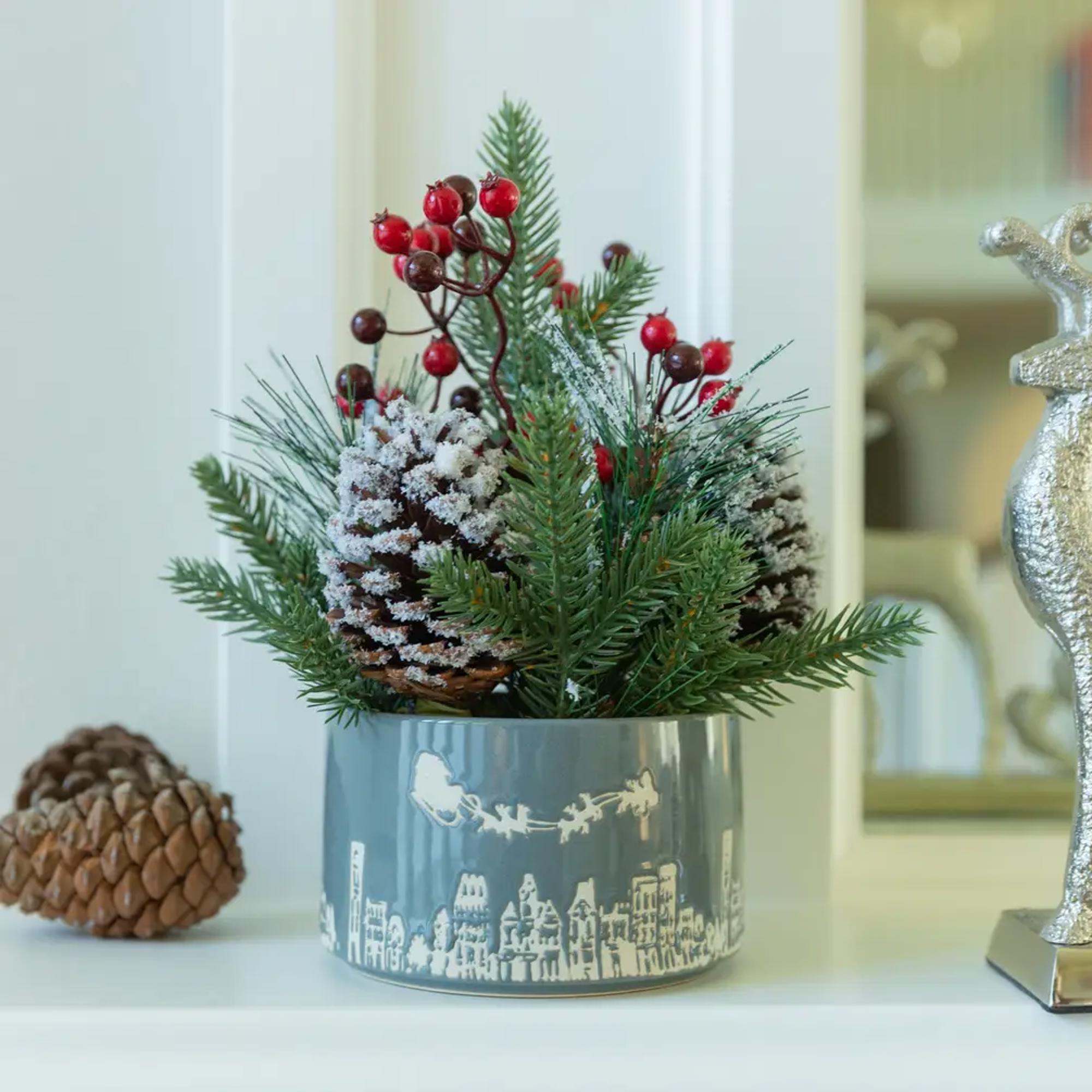 Create instant holiday magic with this frosted winter arrangement styled inside a festive ceramic pot featuring a white town skyline and Santa’s sleigh silhouette. Lifelike pine greenery, snowy pinecones, and glossy red berries add seasonal texture and richness, making this the perfect worry-free décor to transition customers from fall into Christmas.