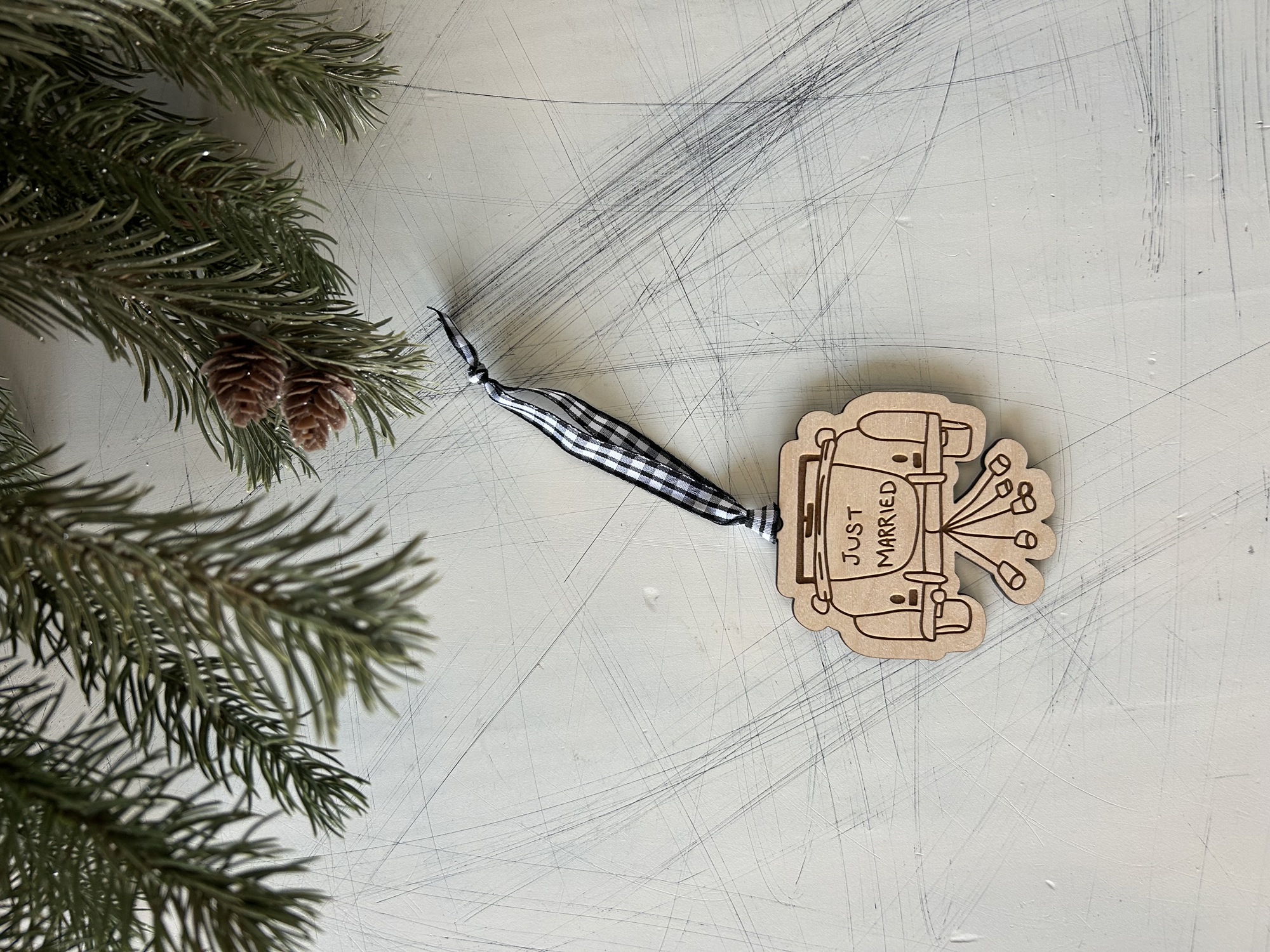 Gift the newlyweds a one-of-a-kind ornament to celebrate the year of their wedding! This is a Novotny Designs original, hand-drawn vintage car with tin cans and a "just married" sign, engraved on natural stained, 1/8-inch maple. A black and white buffalo plaid ribbon is attached.
