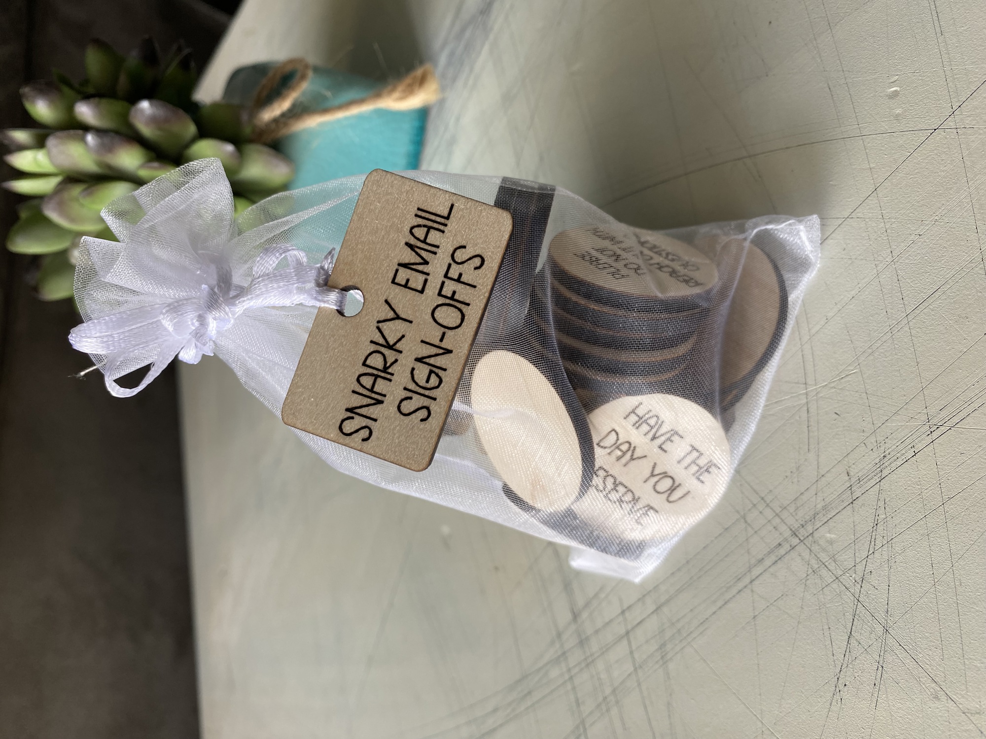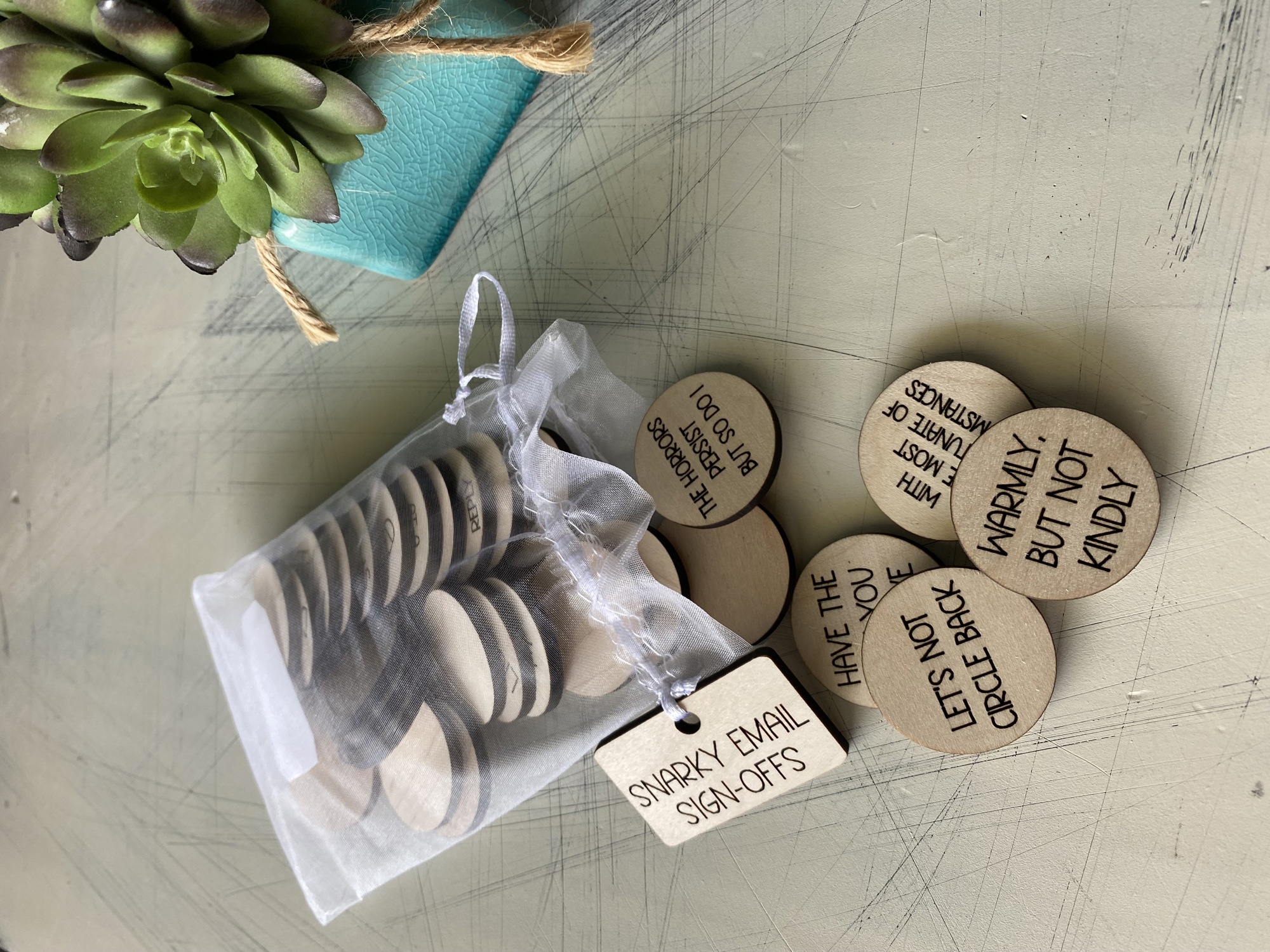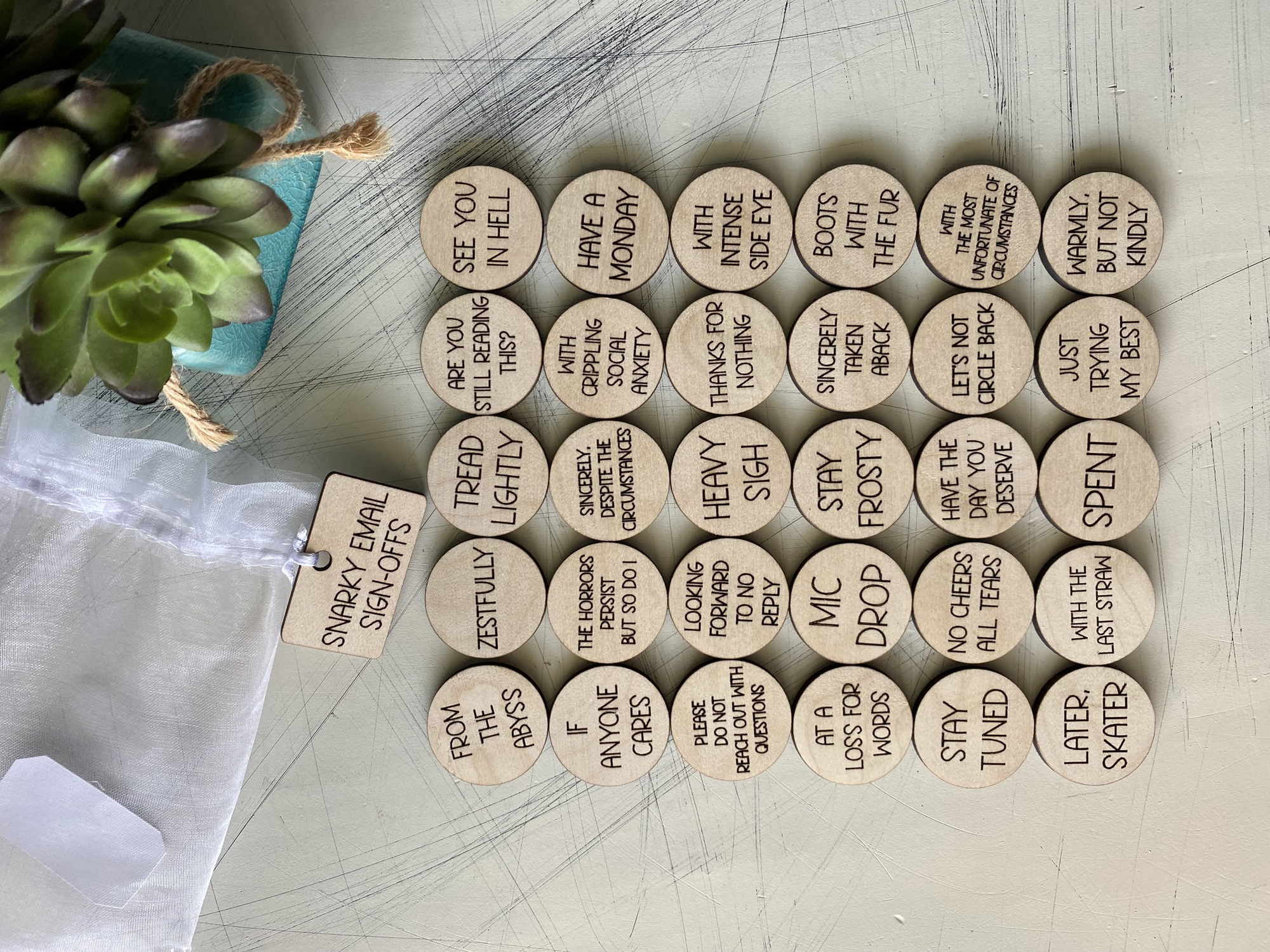 Emails will never be the same again with these Snarky Email Sign-offs! Featuring 30 wood tokens, engraved with humorous ways to end an email, these make the perfect gift for your friend, coworker, or even yourself. Sincerely is a thing of the past. Time to add some sass and make your emails memorable.
