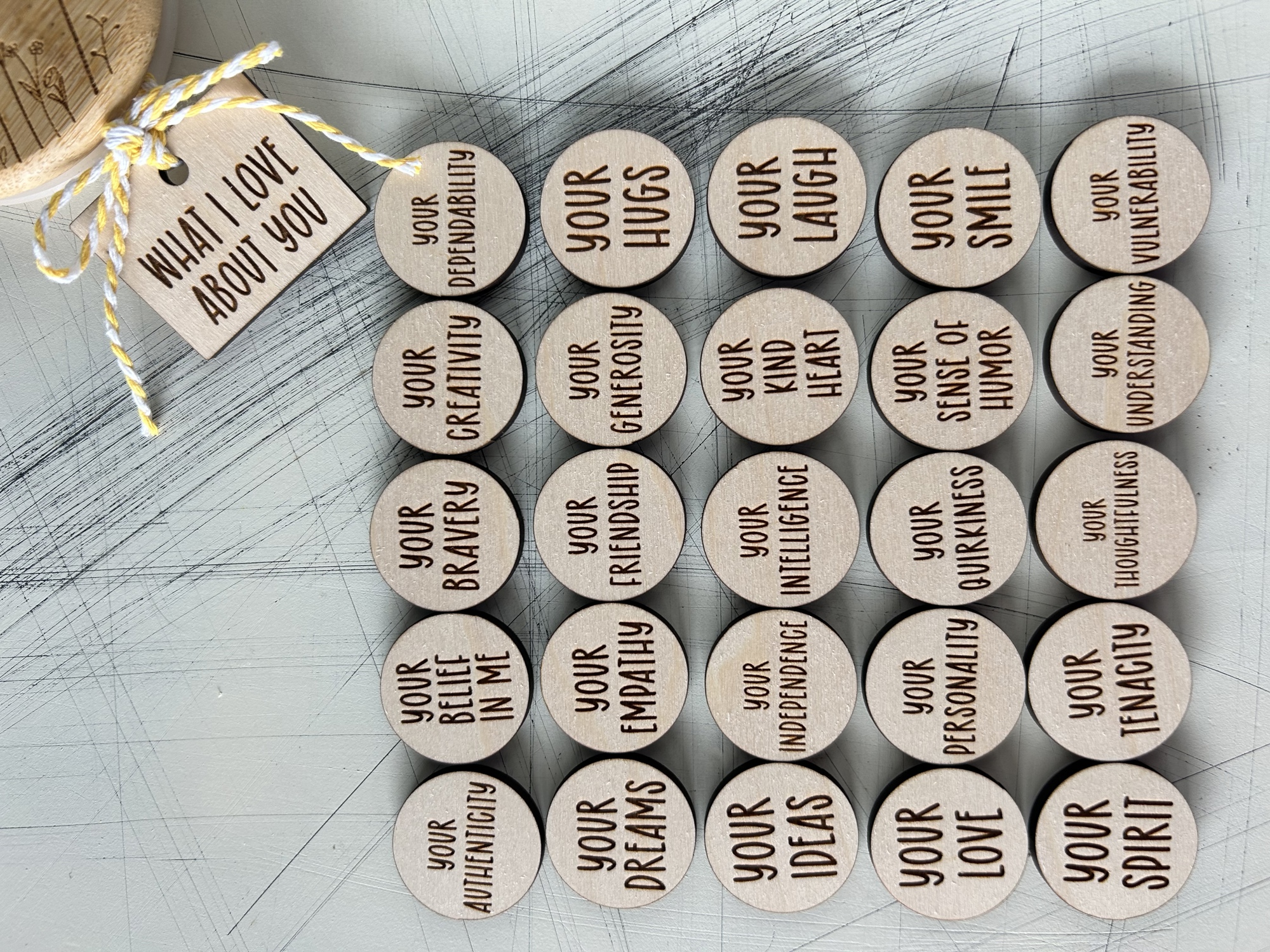 Share what you love about them with these 25 tokens, presented in a 6-oz glass jar. Bamboo jar lid is engraved with hand-drawn flowers.