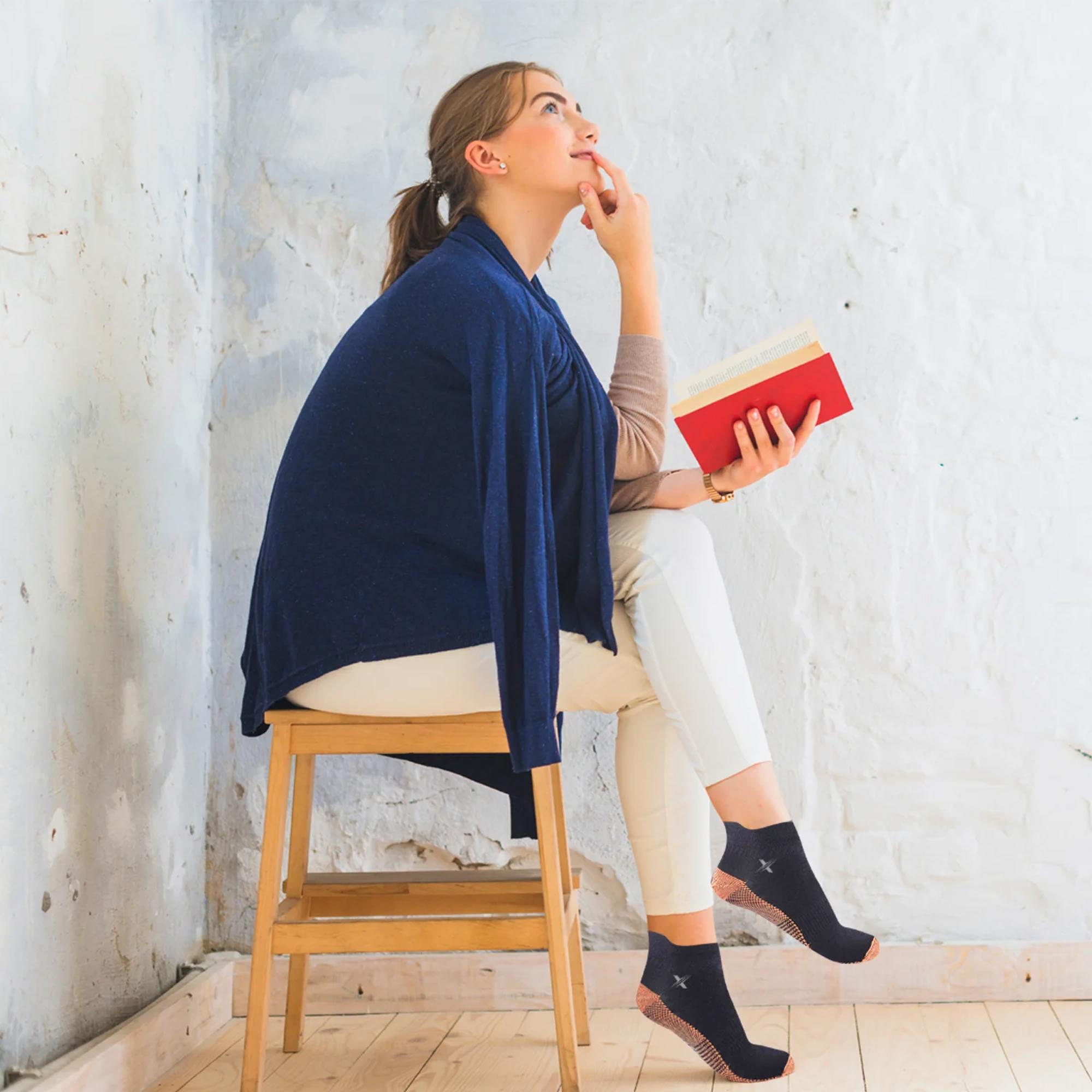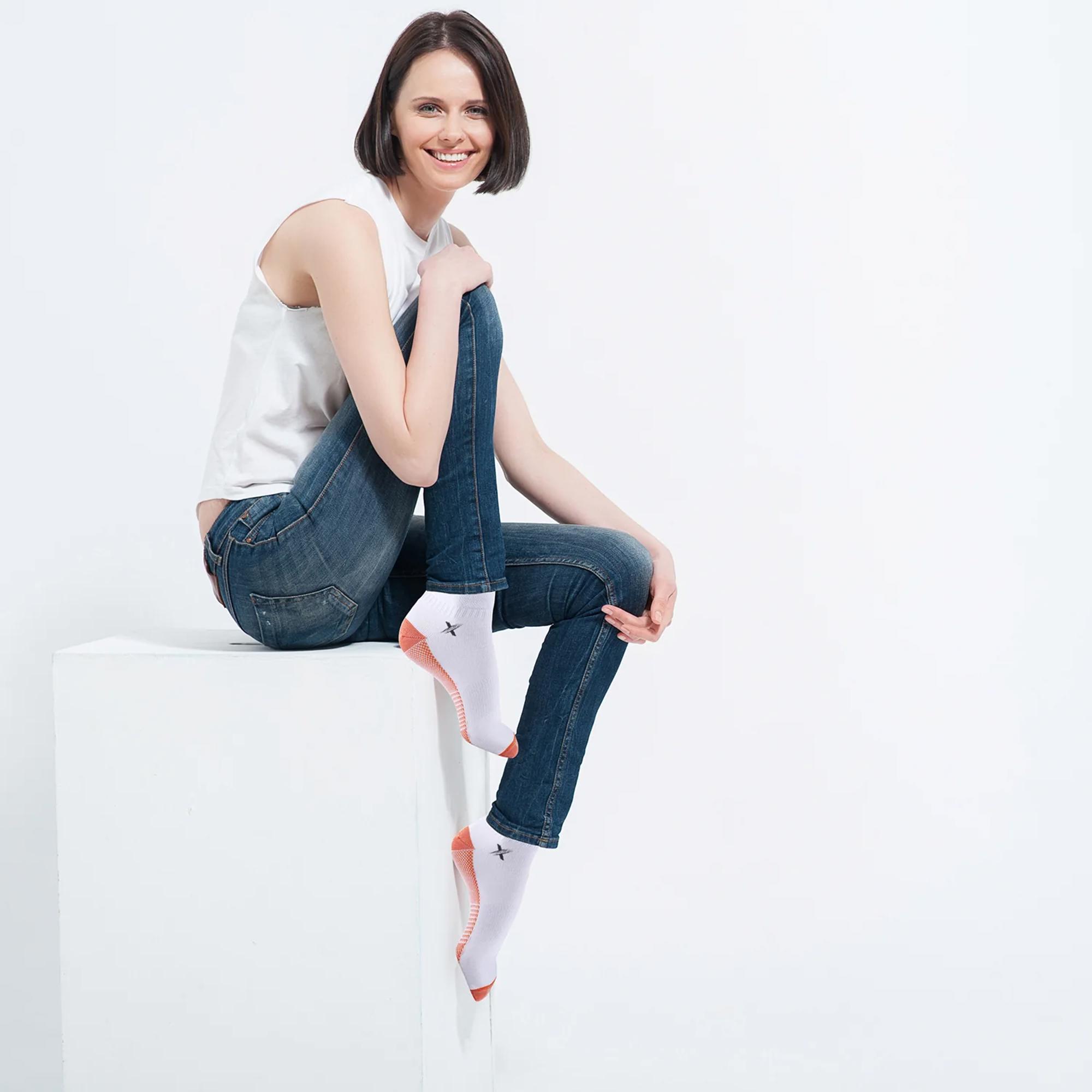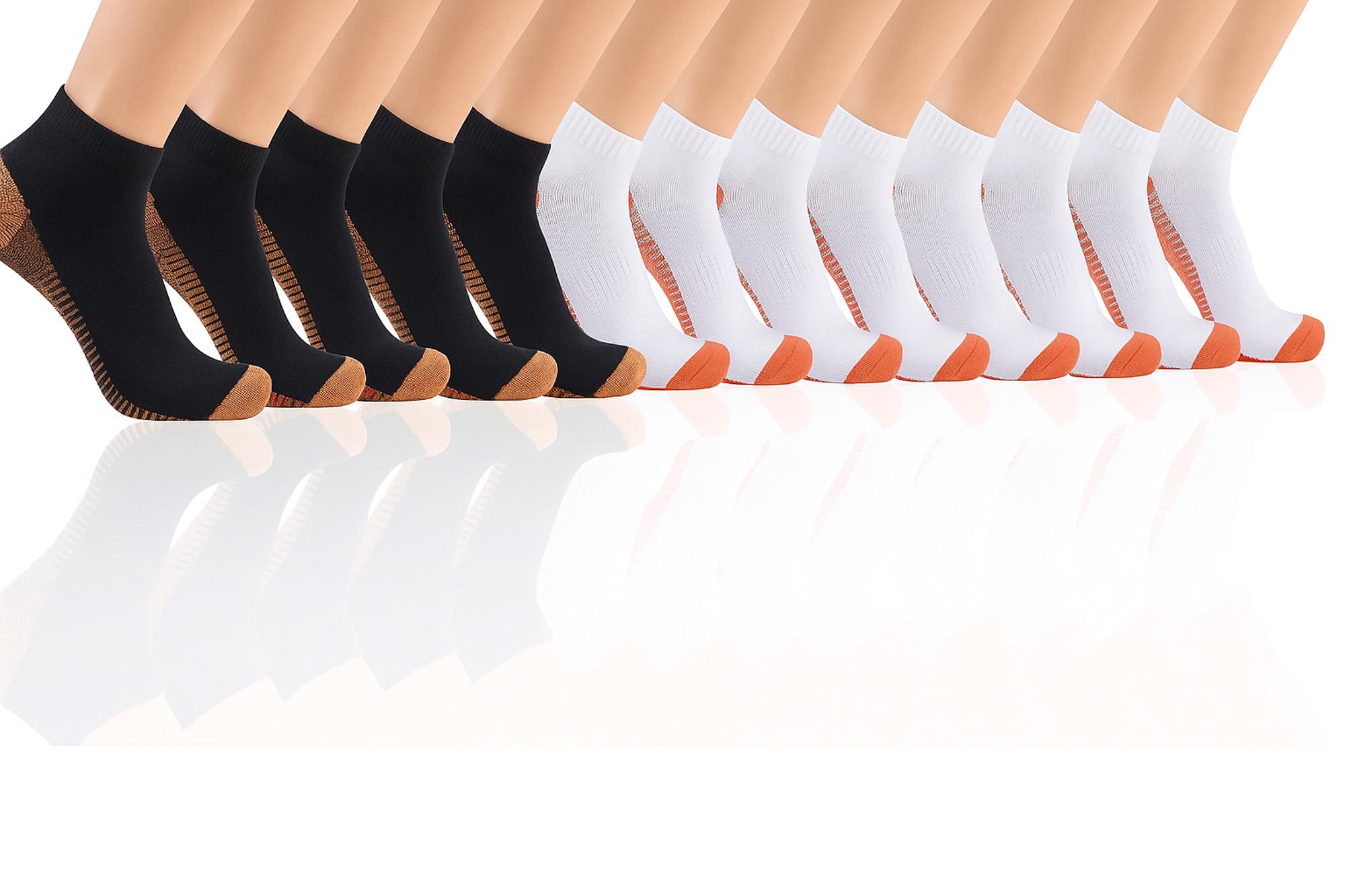 Ankle-length compression socks are infused with copper to help promote blood flow to the feet during exercise, which may reduce swelling and fatigue.