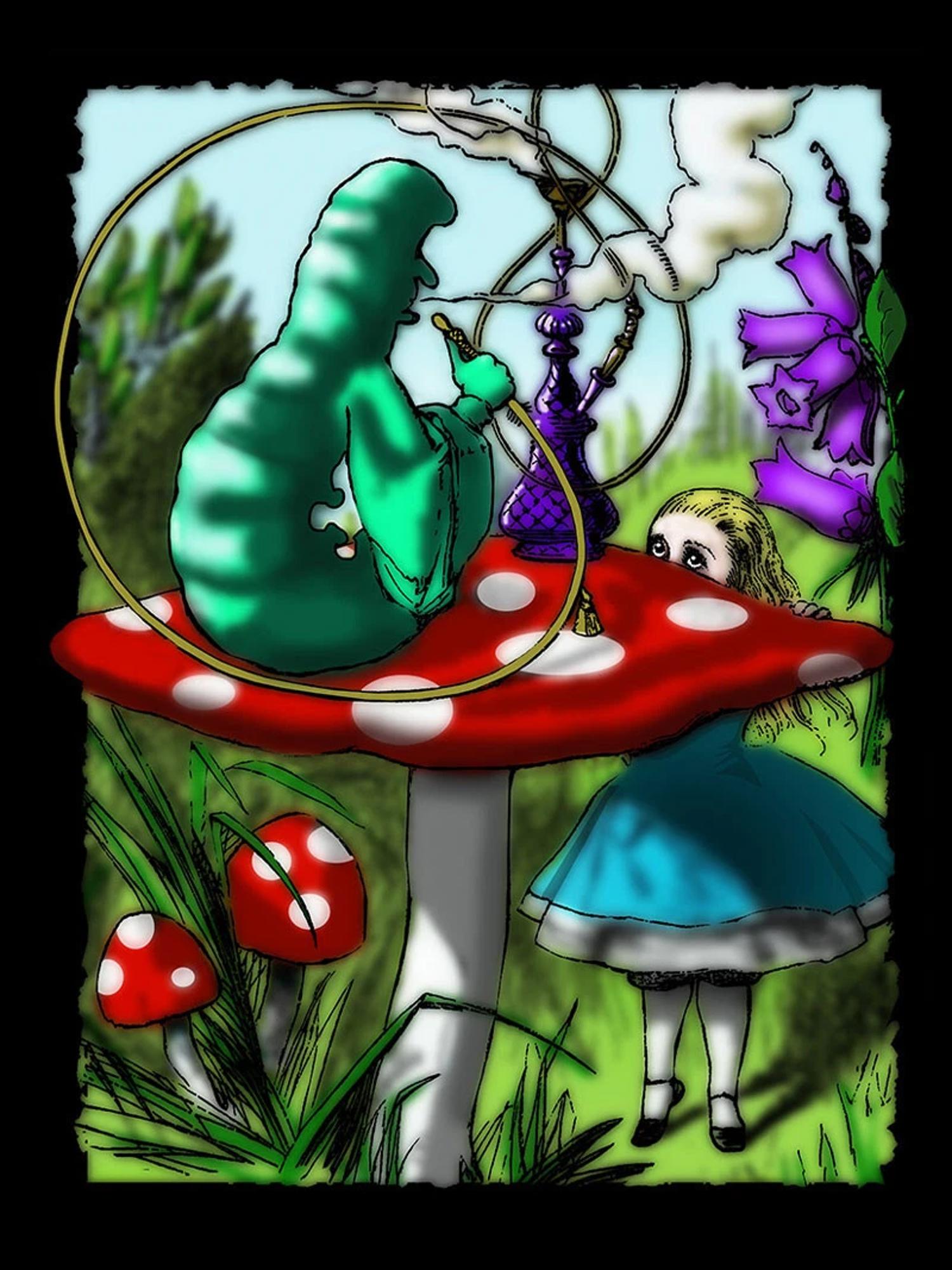 Unique Wonderland Design: Alice smoking pot on a mushroom—perfect for cannabis enthusiasts, fantasy lovers, and anyone who embraces bold, alternative style.