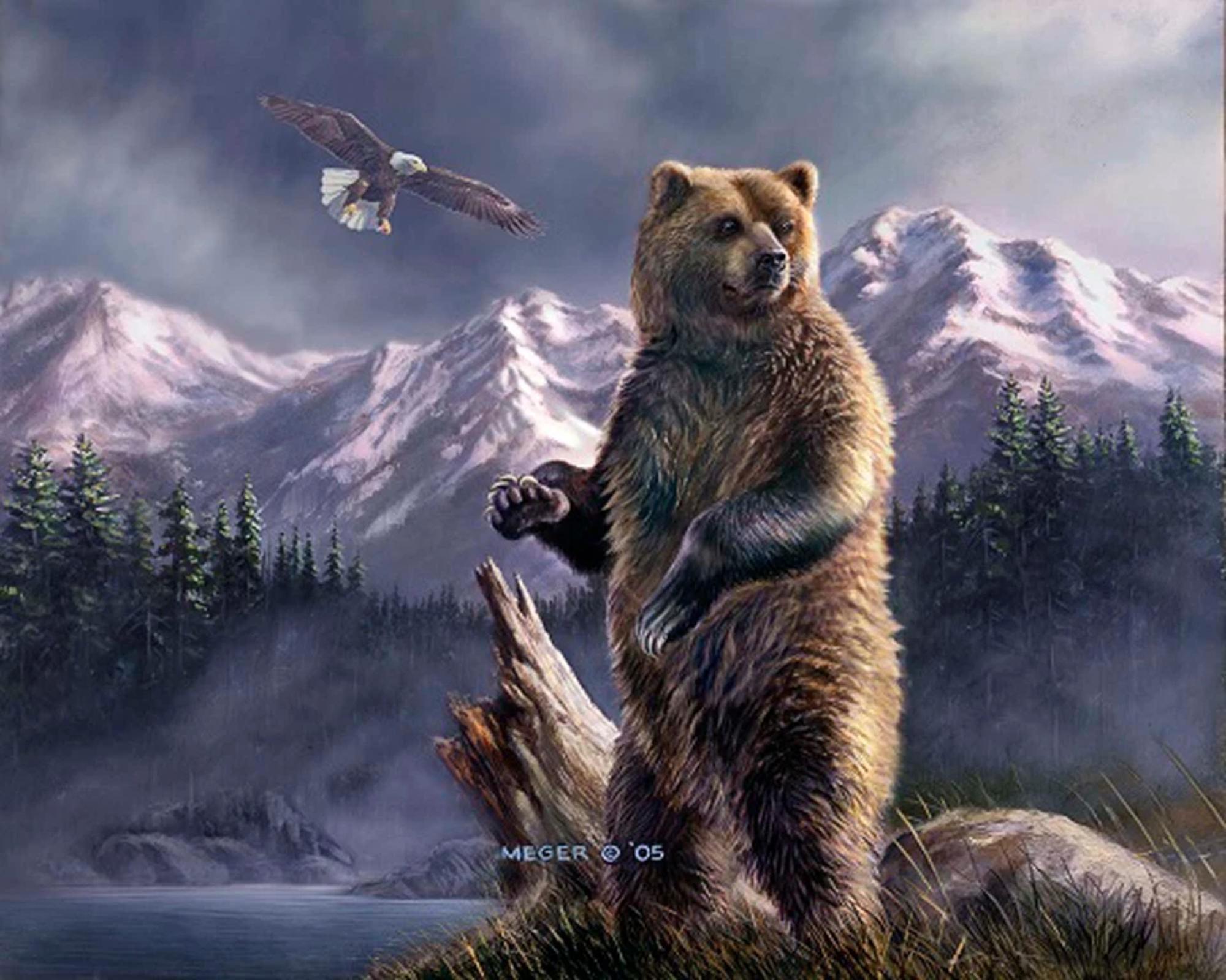 Bring the beauty of the wild into your home with this stunning blanket, featuring a majestic grizzly bear and a soaring bald eagle set against a breathtaking mountain backdrop.