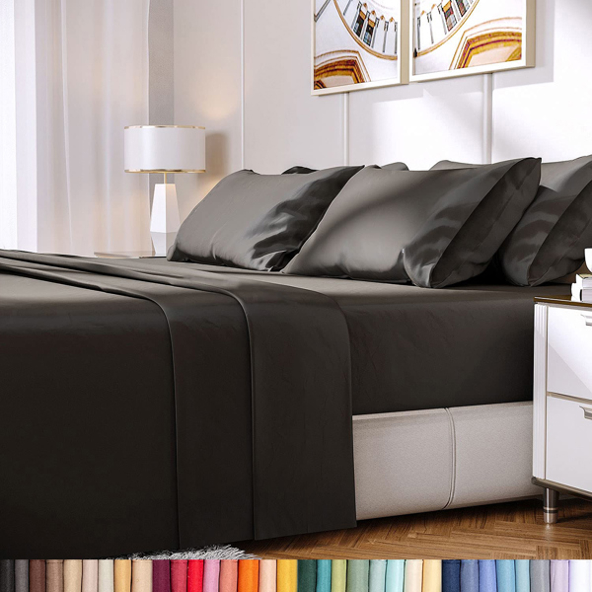 Rayon from bamboo blend 6-piece sheet set deep pockets to easily fit any mattress. We pride ourselves on our 6-piece sheet sets premium quality buttery soft double-brushed fabric with four cooling silky pillowcases for deep luxurious sleep. Cooling and breathable our machine-washable sheet set is made of super-fine fibres that resist pilling tearing shrinking and fading. Unlike other sheets queen size that are ill-fitting and a struggle to get on the bed our queen-fitted sheets have deep pockets to fit mattresses up to 16 inches for a quicker easier time making the bed. Features: We use ultra-high quality rayon from bamboo fabric: rayon from bamboo is the absolute perfect fabric for those who want extremely soft and cool sheets. The highest quality rayon from bamboo fabric mixed with microfiber brushed polyester is used to make it softer than even the finest Egyptian-quality cotton and far more breathable. Extra deep pocket queen: these bed sheets are for very deep pocket mattresses. They fit with pockets that are 16 inches deep mattresses. There's a stretchable elastic around the extra deep fitted sheet which stretches for a nice tug around your mattress. Superb sheet set treat yourself to a matching sheet set for any of your bedrooms. Each luxurious sheet set contains 1 fitted sheet 1 flat sheet and 4 standard pillowcases (excluding Twin size). Plus you won't lose any shuteye from fitted sheets that fall off. Deep pockets thick elastic and built-in sheet straps make your new soft sheets stay in place. Perfect fit for any bed sleep soundly for years to come. Your deep pocket sheets are fade shrink and wrinkle-resistant. No matter if you need toddler bedding sets for boys full-size sheets for your teen or queen and king-size sheets for yourself we've got you (and your bed) covered. Dimensions Twin: 1 x Flat sheet: 66 x 96 1 x Fitted sheet: 39 x 75 2 x Pillowcase: 20 x 30. Full: 1 x Flat sheet: 81 x 96 1 x Fitted sheet: 54 x 75 4 x Pillowcase: 21 x 30. Queen: 1 x Flat sheet: 90 x 102 1 x Fitted sheet: 60 x 80 4 x Pillowcase: 21 x 30. King: 1 x Flat sheet: 102 x 105 1 x Fitted sheet: 78 x 80 4 x Pillowcase: 21 x 40. Cal King: 1 x Flat sheet: 108 x 102 1 x Fitted sheet: 72 x 84 4 x Pillowcase: 21 x 40