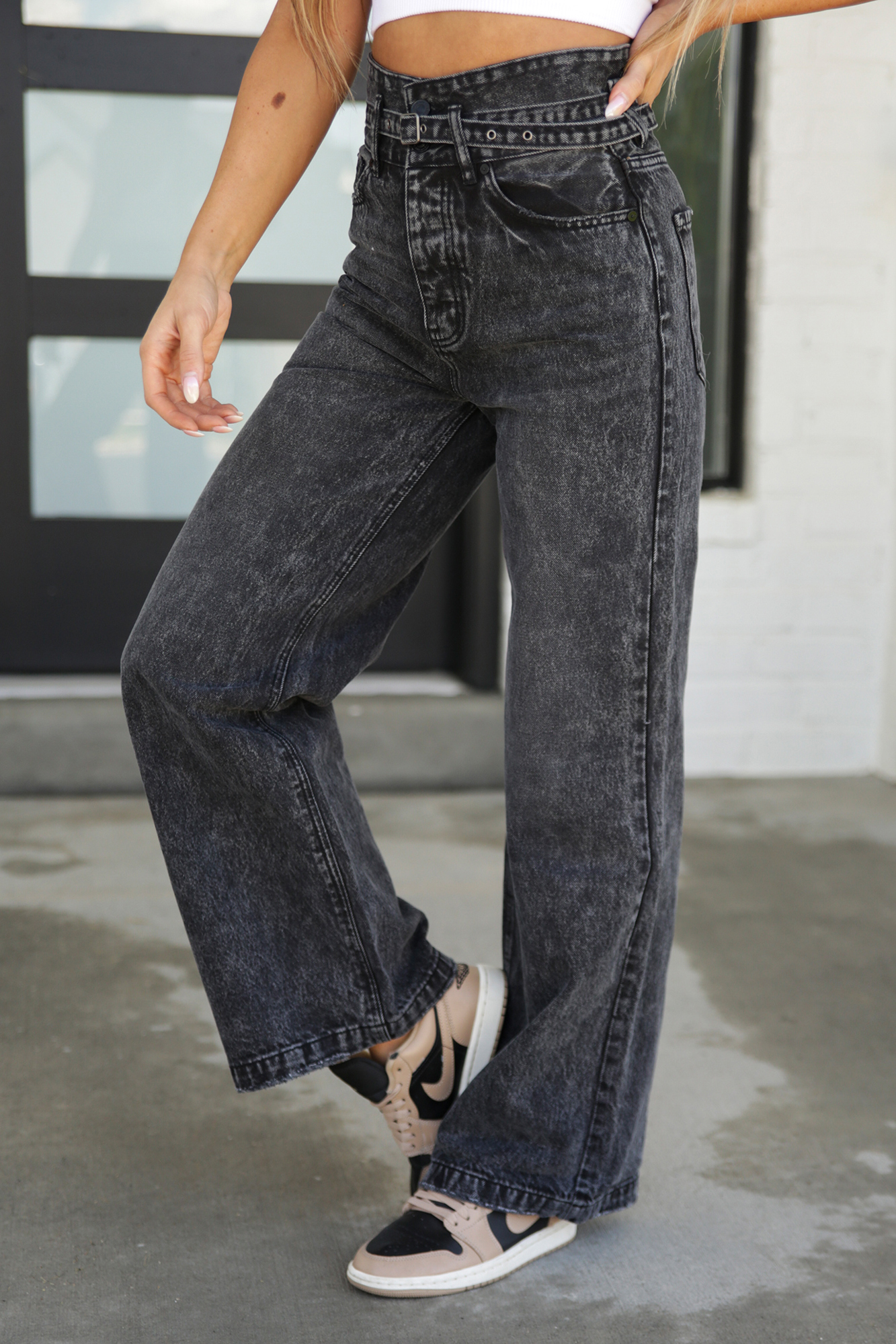 Kancan Ultra High Jeans come in a wide leg cut with a faded wash design, and a denim belt that loops around the waist. Sits high above the natural waistline and down the thigh, with a wide leg at the calf. Features a classic five-pocket design, button front, and a hidden button-down closure. Look edgy in a cropped tee and these dark denim jeans.