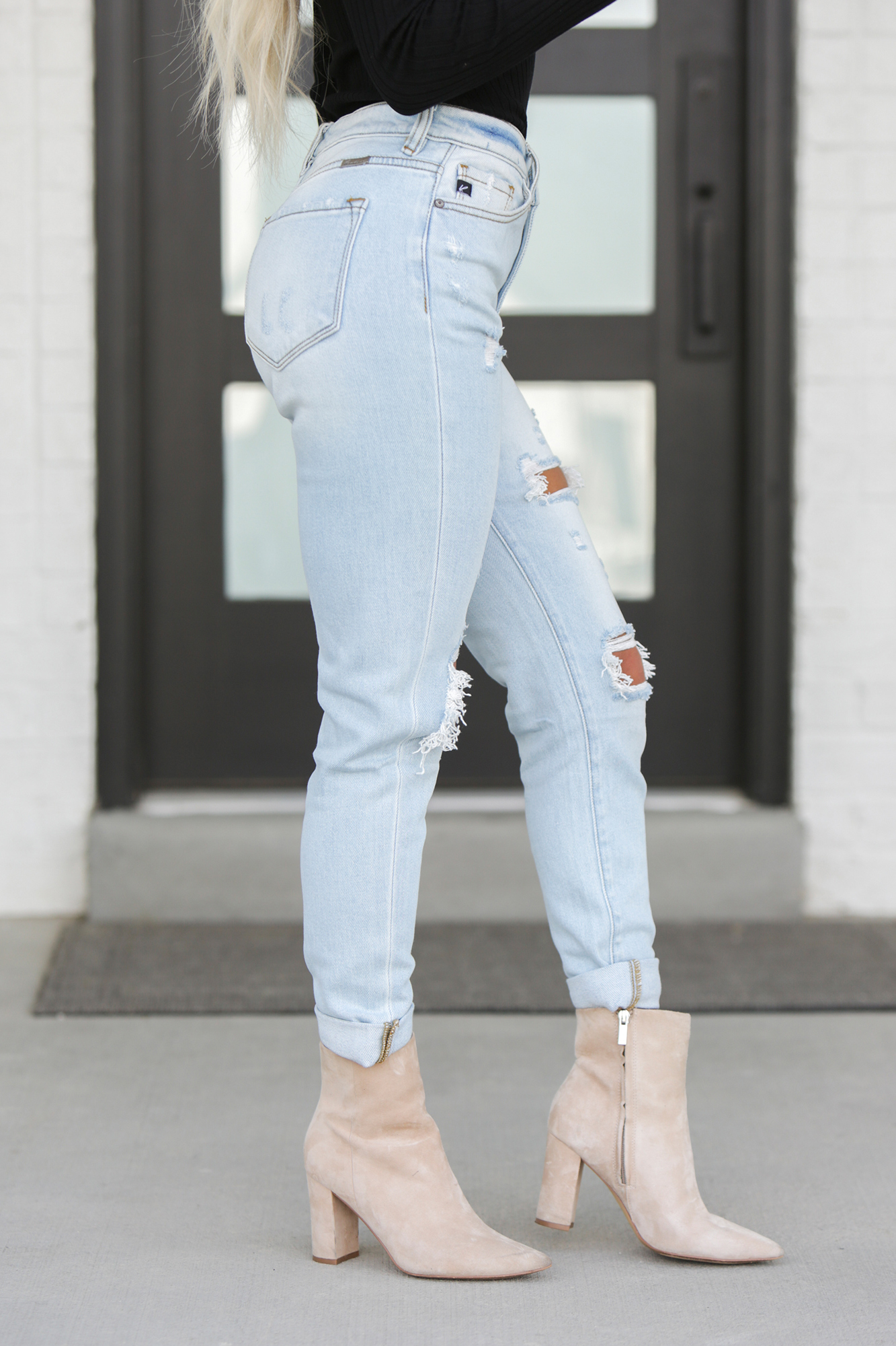 Our Ritta Light Wash Mom Jeans will be your go-to denim for your everyday uniform! These 90s-inspired light wash straight leg jeans feature a high-rise waist, destroyed and distressed legs. It's the perfect pair of denim to style with sneakers for the day or heels at night!