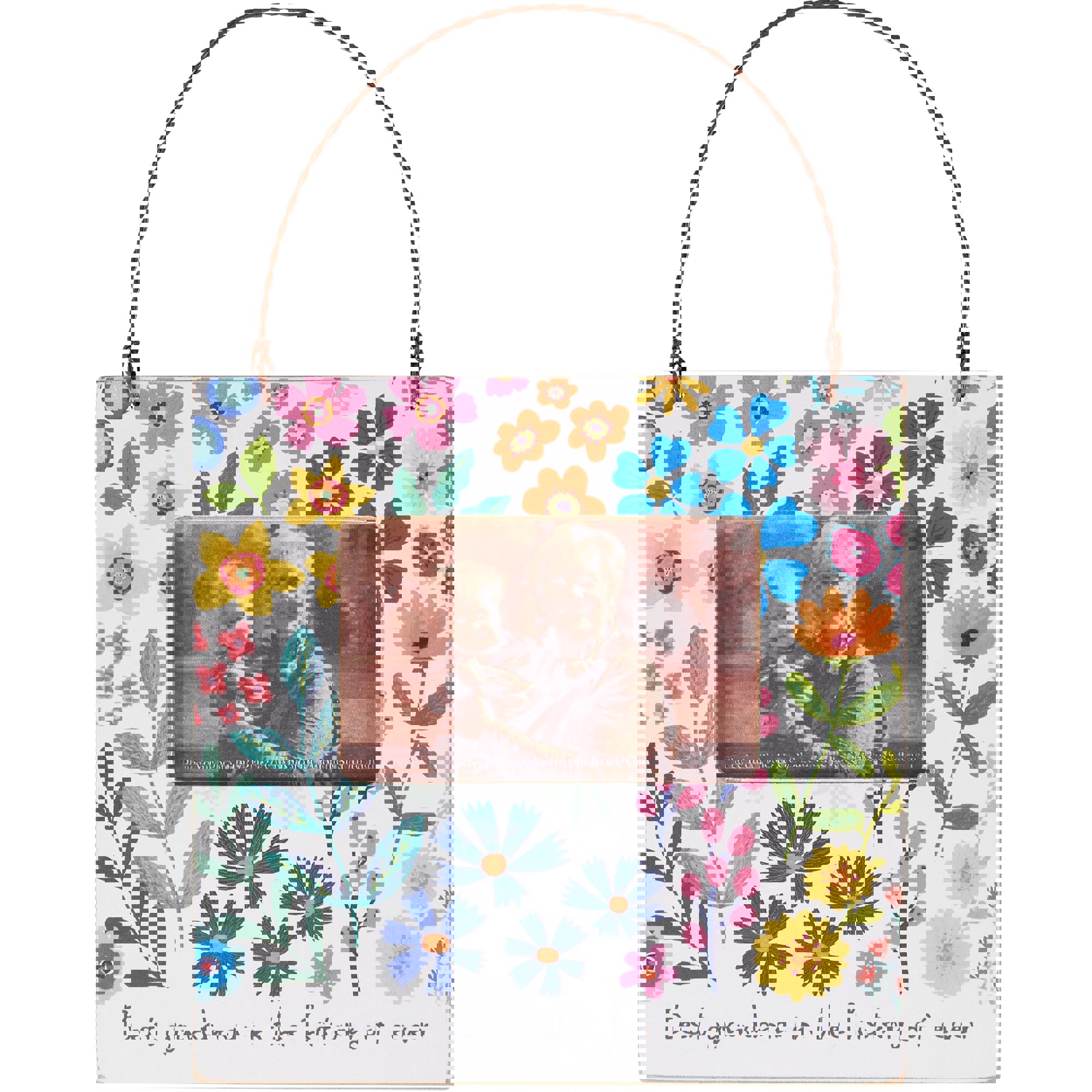 A small wooden frame from our Mother's Day Collection displaying vibrant hand illustrated florals and a heartwarming grandma-themed sentiment that reads "Best Grandma In The History Of Ever." Frame fits a 3 inch x 2 inch photo and can easily be replaced via clips on back. Our Best Grandma mini frame is easy to display using attached twisted wire hanger or use the included removable peg to free-stand. A lovely gift perfect for Christmas, Mother's Day or displaying favorite memories as everyday home décor.