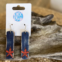 Add a splash of coastal charm to your outfit with these hand-painted wood earrings, featuring a rectangular dangle shape and distressed navy background. At the base, a vibrant coral starfish pops with preppy coastal style, making these the perfect accessory for beach lovers and OBX fans alike. Finished with silver-tone hook closures, these earrings are handmade right here in the Outer Banks and are lead and nickel compliant for sensitive ears. Lightweight and eye-catching, they’re the ideal blend of seaside flair and effortless style.