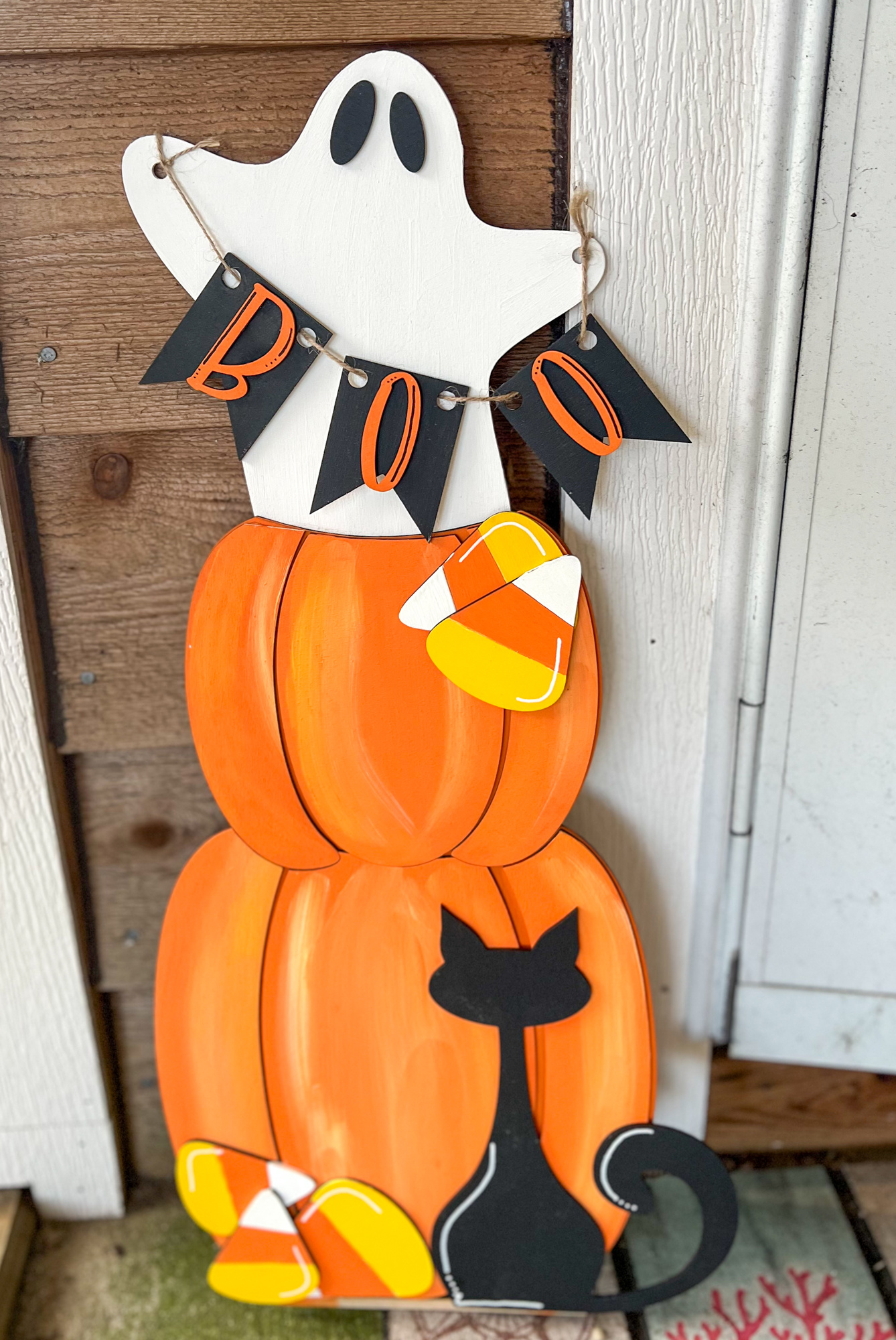 Hand Painted Halloween Porch Leaner – Birch Wood Ghost, Pumpkins, Cat & Candy Corn