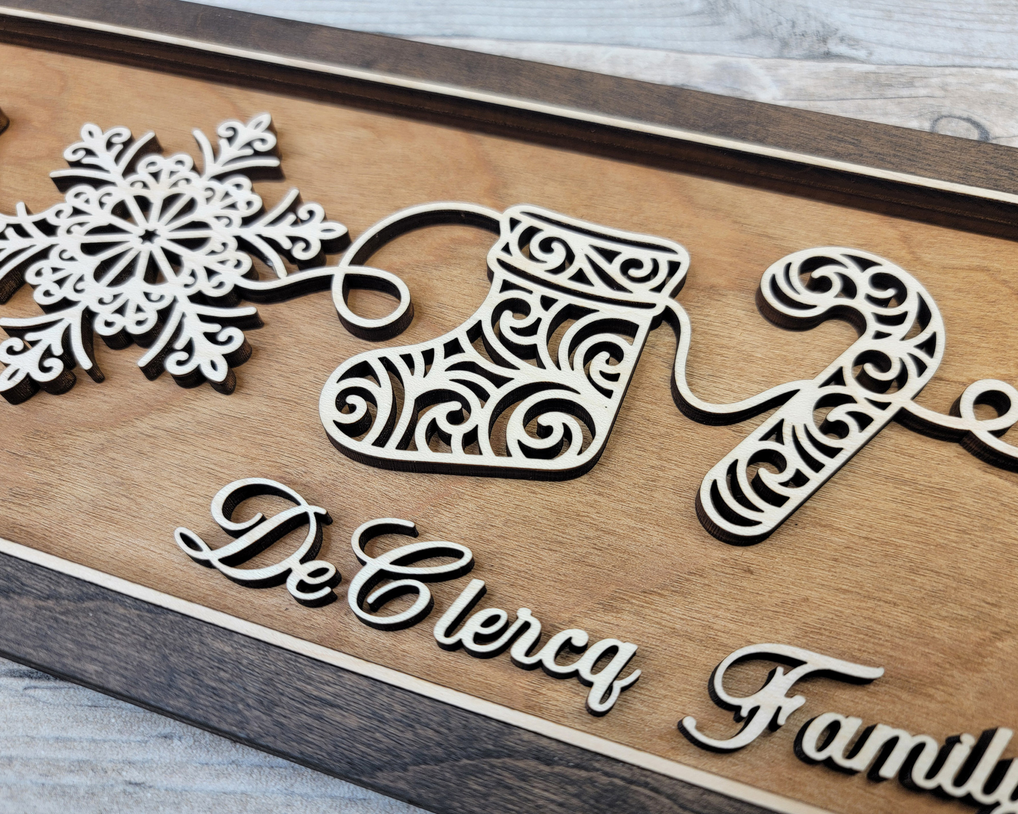 Featuring a detailed line art design of classic holiday elements, this piece celebrates the joyful spirit of Christmas through simple, timeless artistry. Its elongated layout makes it perfect for mantels, shelves, or entryways — bringing warmth, charm, and creative flair to any space.