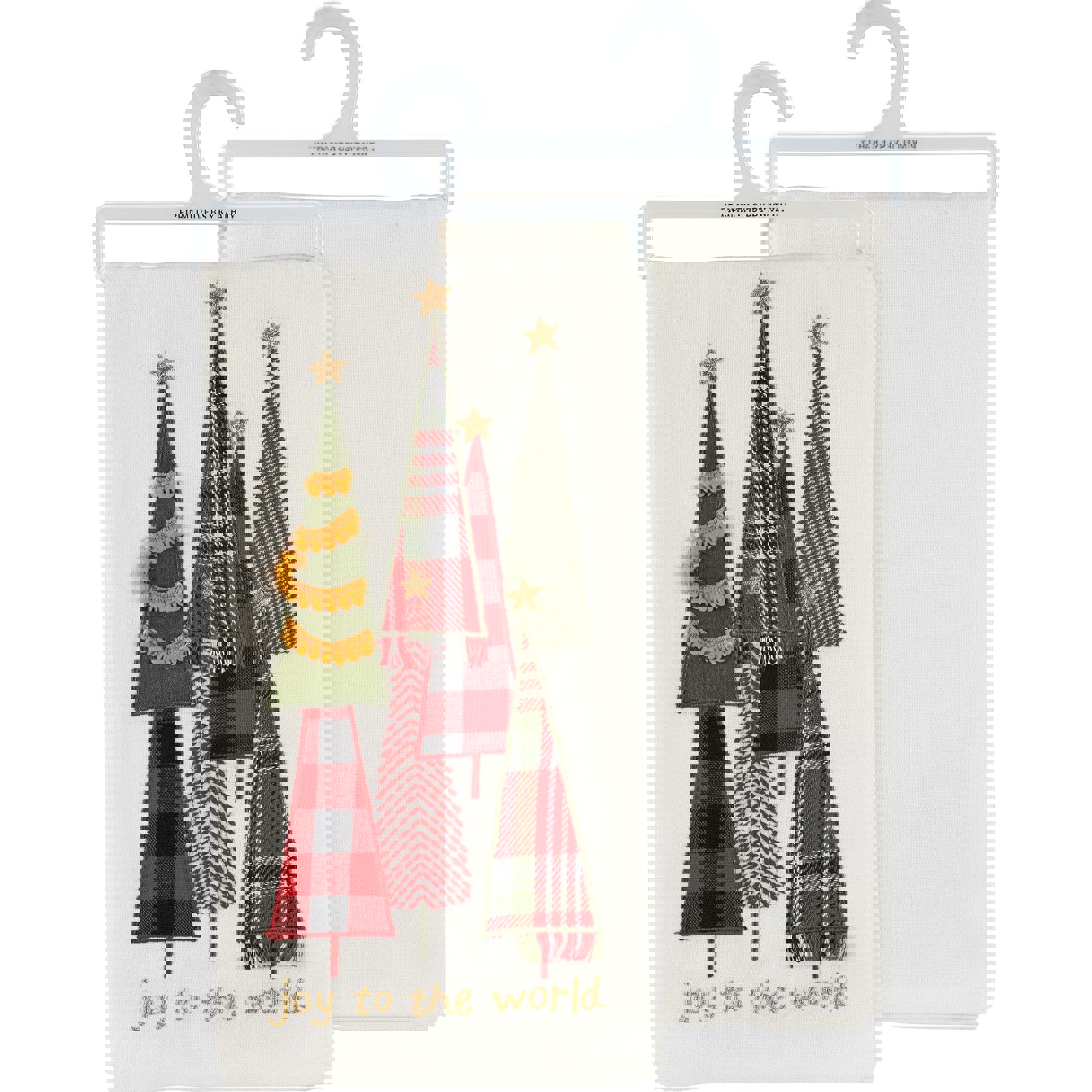 A cream cotton kitchen towel from our Christmas Collection displaying various Christmas tree designs featuring plaid, pom, and embroidered accents with embroidered "Joy To The World" sentiment. Our Joy To The World kitchen towel is machine-washable for convenient cleaning. Packaged on a clear plastic hanger to easily display on rack. A unique and functional seasonal ki