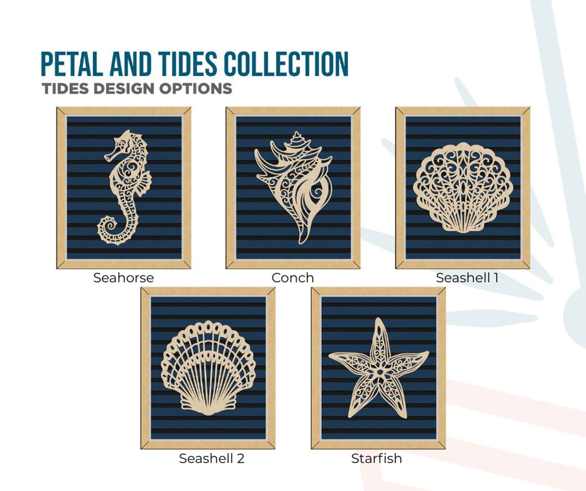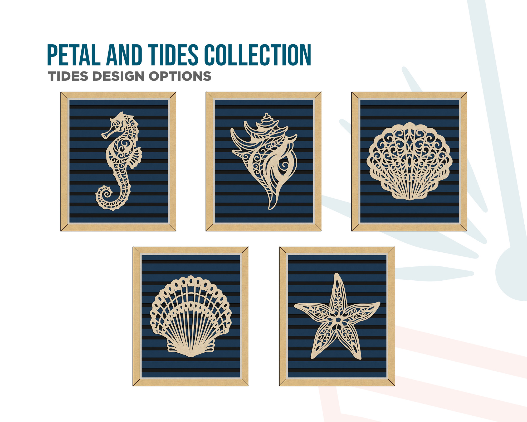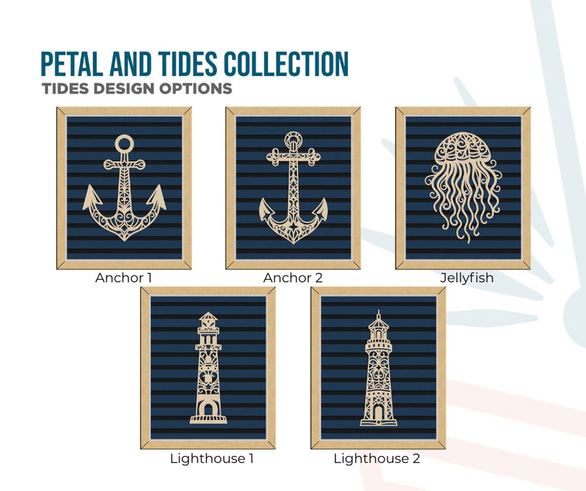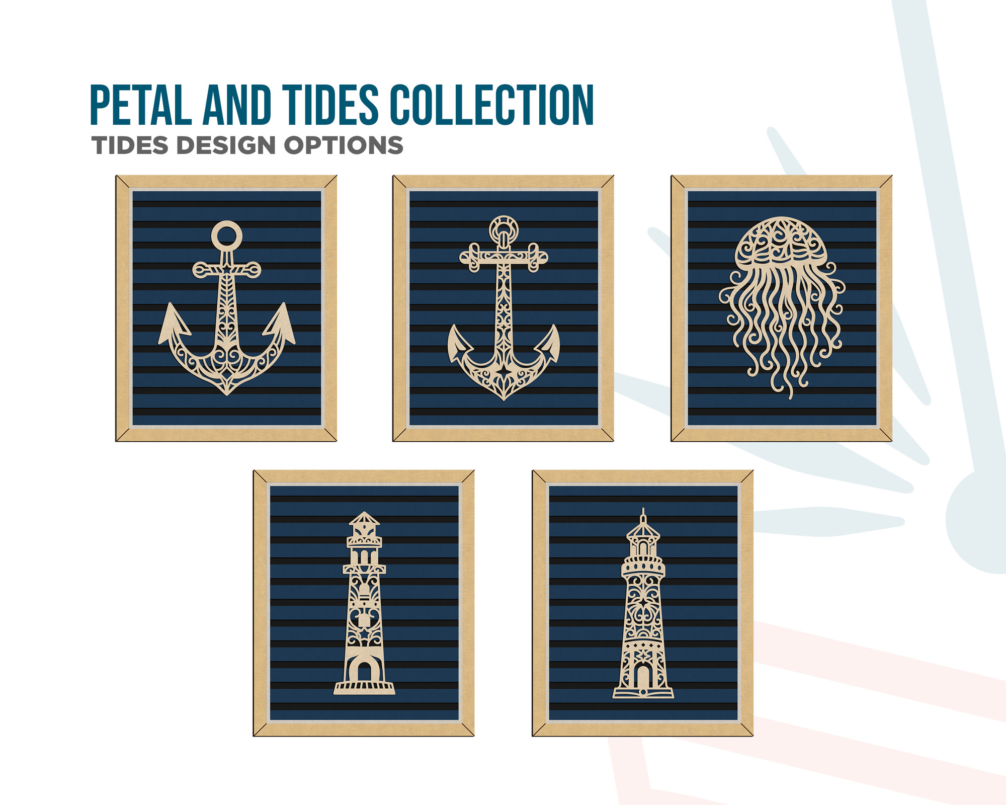 The middle layer showcases elegant line-art sea creatures and nautical symbols, creating a clean, modern coastal feel