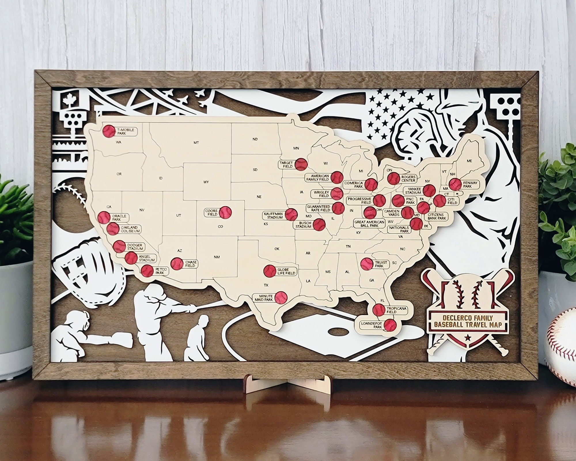 Every Major League Baseball stadium is engraved in its location, with spaces across the U.S. map to place our wooden baseball markers as you check ballparks off your bucket list.